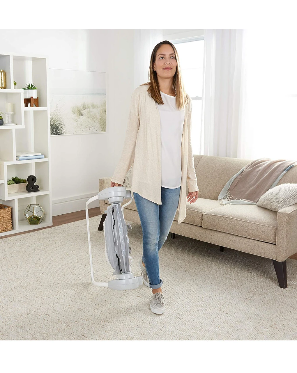 Leggera e ripiegabile, si appiattisce completamente per essere trasportata ovunque. 6 velocità di dondolamento con timer di spegnimento automatico a 3 tempi (30, 45 e 60 minuti) e 12 melodie rilassanti. Arco giochi removibile. Colori neutri adatti a femminuccia o maschietto. Peso articolo: 1,85 KG. Dimensioni da aperta: 57,2 x 72,4 x 58,4 cm. Pile necessarie: 4C. Rivestimento completamente sfoderabile e lavabile in lavatrice.