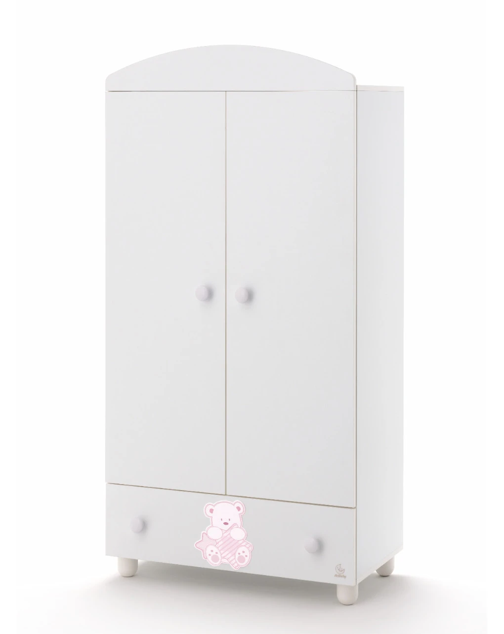 Armadio My Teddy con decori rosa è realizzato con pannelli di truciolare nobilitato, cimasa superiore sagomato e arrotondato.