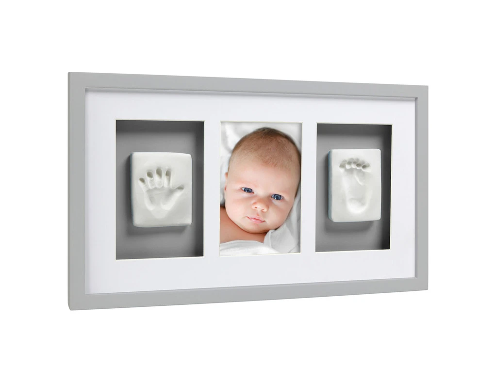 La cornice contiene due spazi per il calco della manina e del piedino del tuo bimbo e uno centrale per inserire una foto.