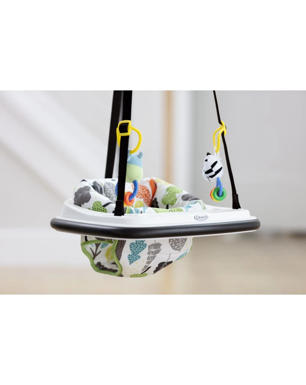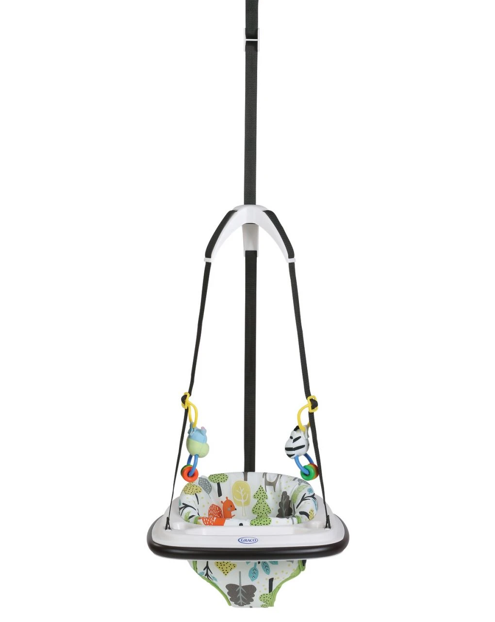 Bumper Jumper di Graco include 2 peluche per giocare ed è dotato di una clip regolabile che permette di sistemare più comodamente il bambino.