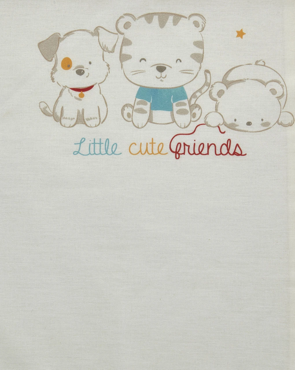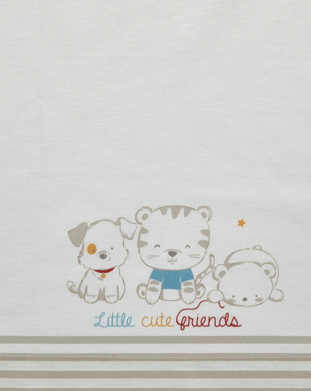 Pratico completo per culla e carrozzina in cotone composto da un lenzuolo sopra con tre simpatici animaletti stampati sul fronte e bordo con la stampa millerighe; una federa con bordi stampati in all-over millerighe come il lenzuolo sotto senza angoli. Il set si compone di lenzuolo sotto 80×100 cm, lenzuolo sopra 80×100 cm e federa 26×30 cm.