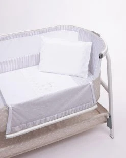 Elegante completino culla/carrozzina realizzato in cotone bianco. Il set è composto da federa, lenzuolo sotto senza angoli e lenzuolo sopra. Il set è decorato dalla stampa d un simpatico orsetto che viene ripreso anche sulle bordure. Il set si compone di lenzuolo sotto 80×100 cm, lenzuolo sopra 80×100 cm e federa 26×30 cm.