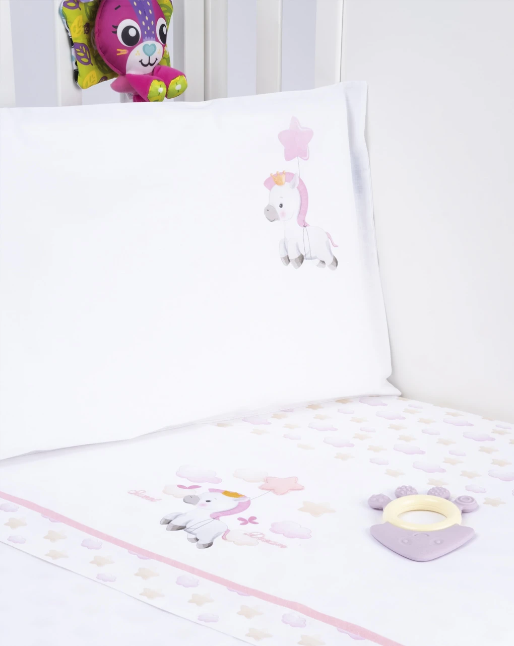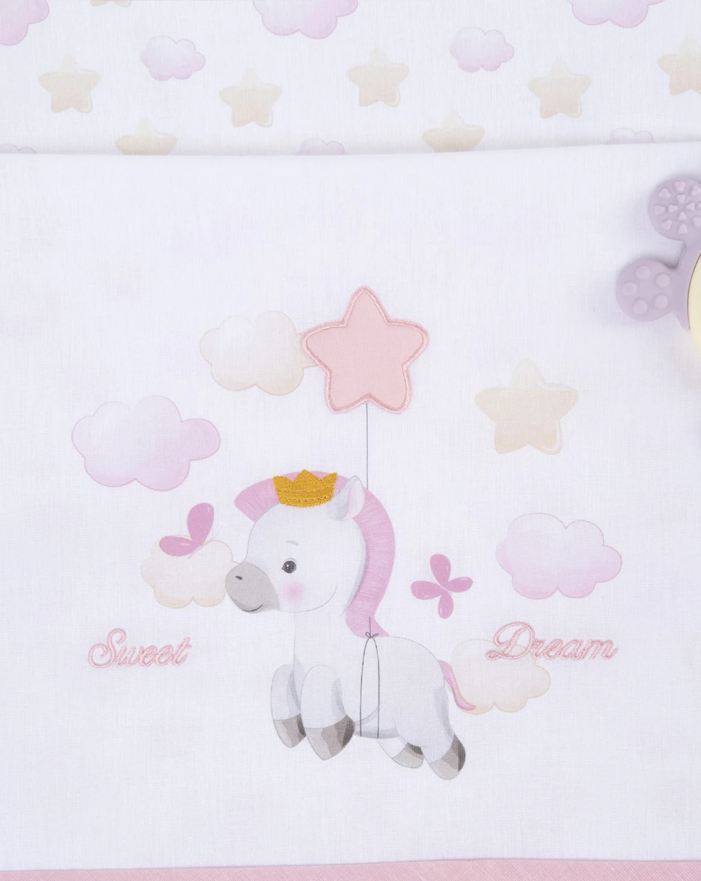 Completo 3 pezzi da bambina in 100% cotone adatto per lettini. Si compone di: federa 35×60 cm, lenzuolo sotto con angoli 60x 135×20 cm, e lenzuolo 120×180 cm. Il completo si presenta su sfondo bianco con stampa allover di stelle in tonalità sfumate e delicata stampa di un cavallino sempre in colorazione tenue ma coordinata; presente anche scritta “Sweet Dream”. Il set 3 pezzi è delicato e maneggevole. Accessori non in vendita. La confezione contiene solo il capo d’abbigliamento