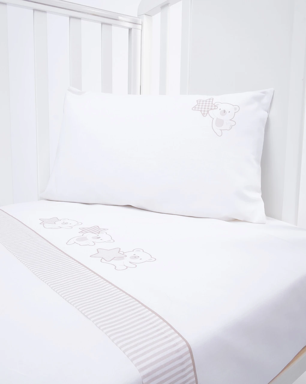 Pratico completo per lettino in cotone composto da un lenzuolo sopra con simpatici orsetti e romantiche stelline stampate in beige sul fronte. Il set si compone di lenzuolo sotto 60×135+20 cm, lenzuolo sopra 120×180 cm e federa 35×60 cm