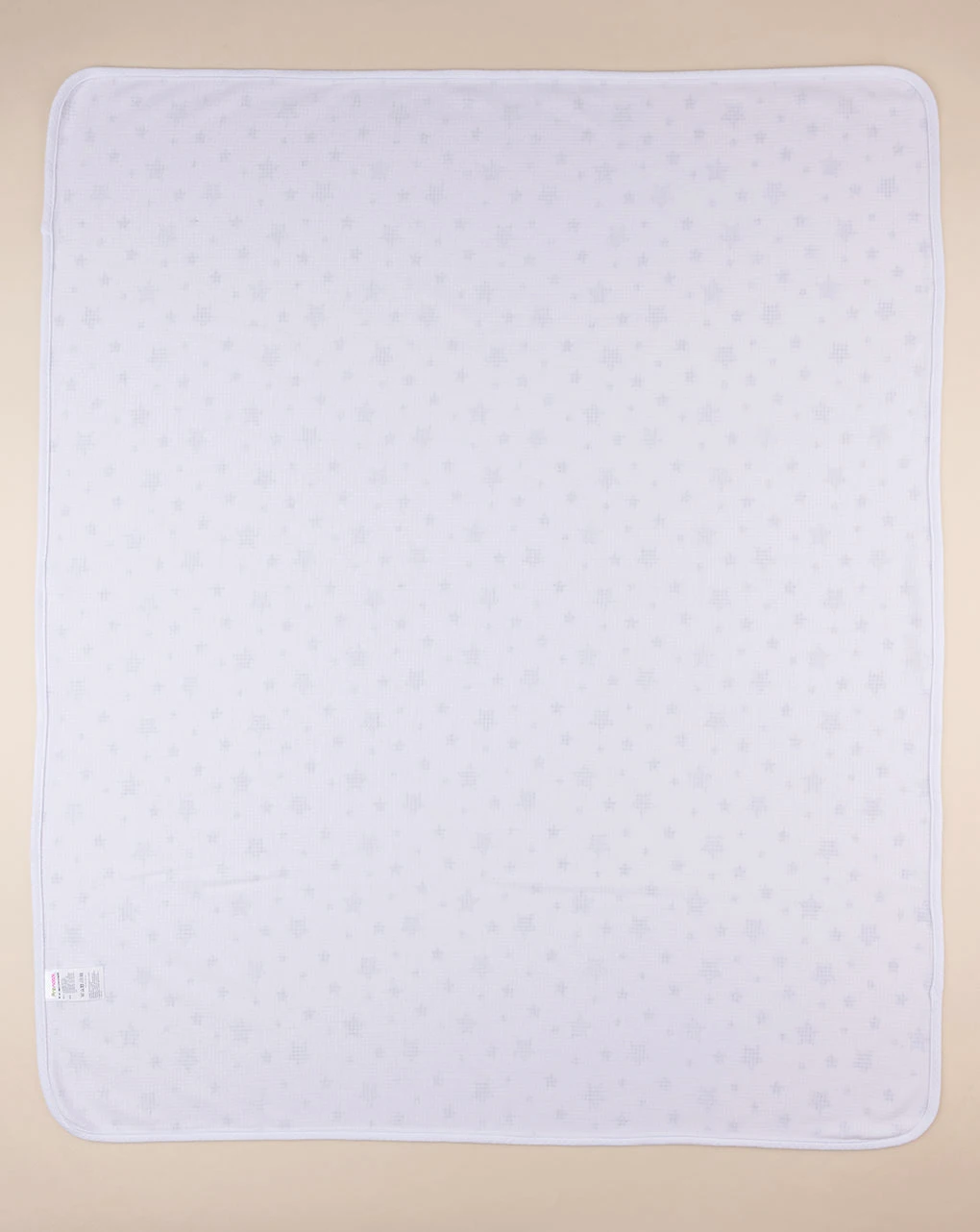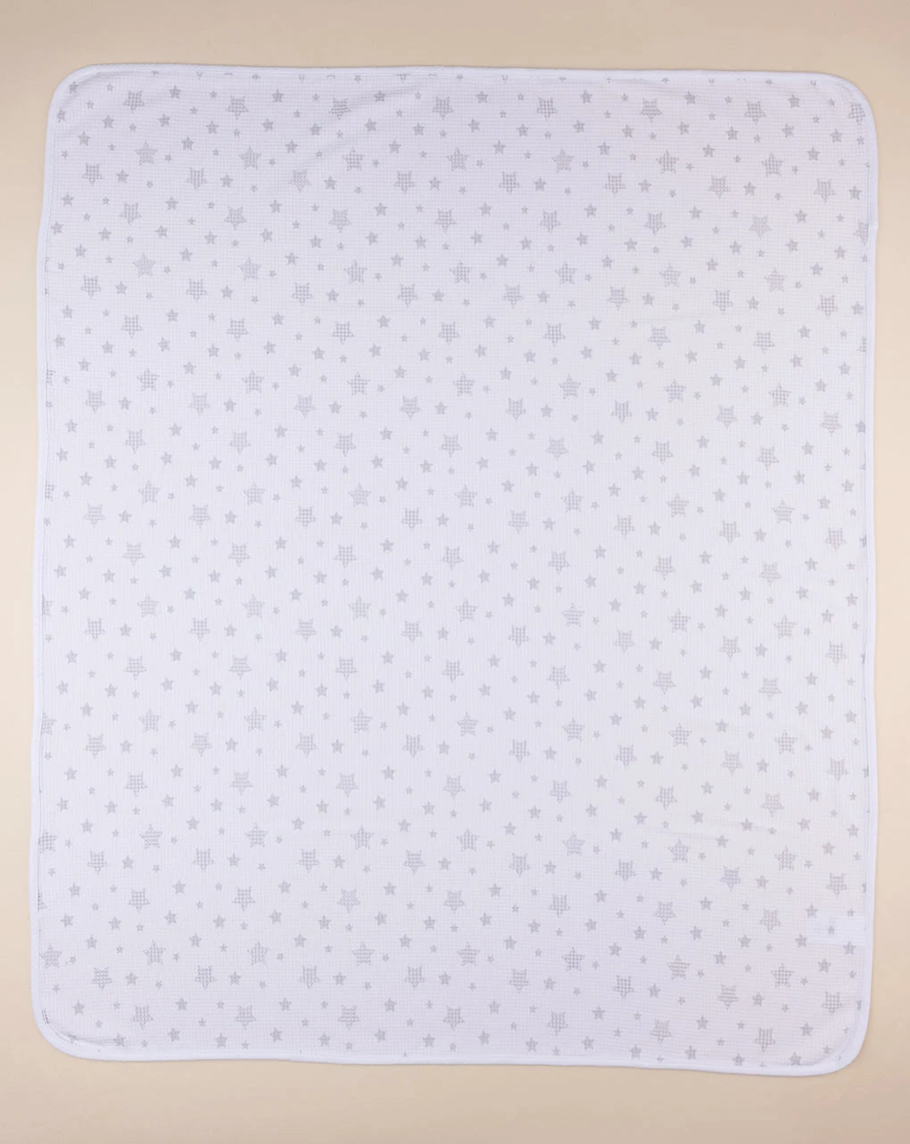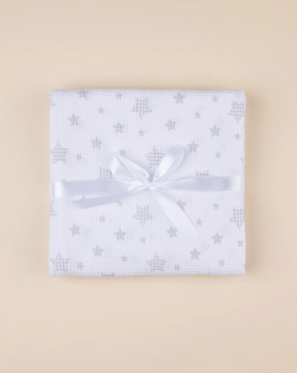 Copertina estiva da neonati perfetta per il loro lettino o per una passeggiata all’aria aperta. La coperta banca è decorata con una fantasia a stelline grigie allover. Accessori non in vendita. La confezione contiene solo il capo.