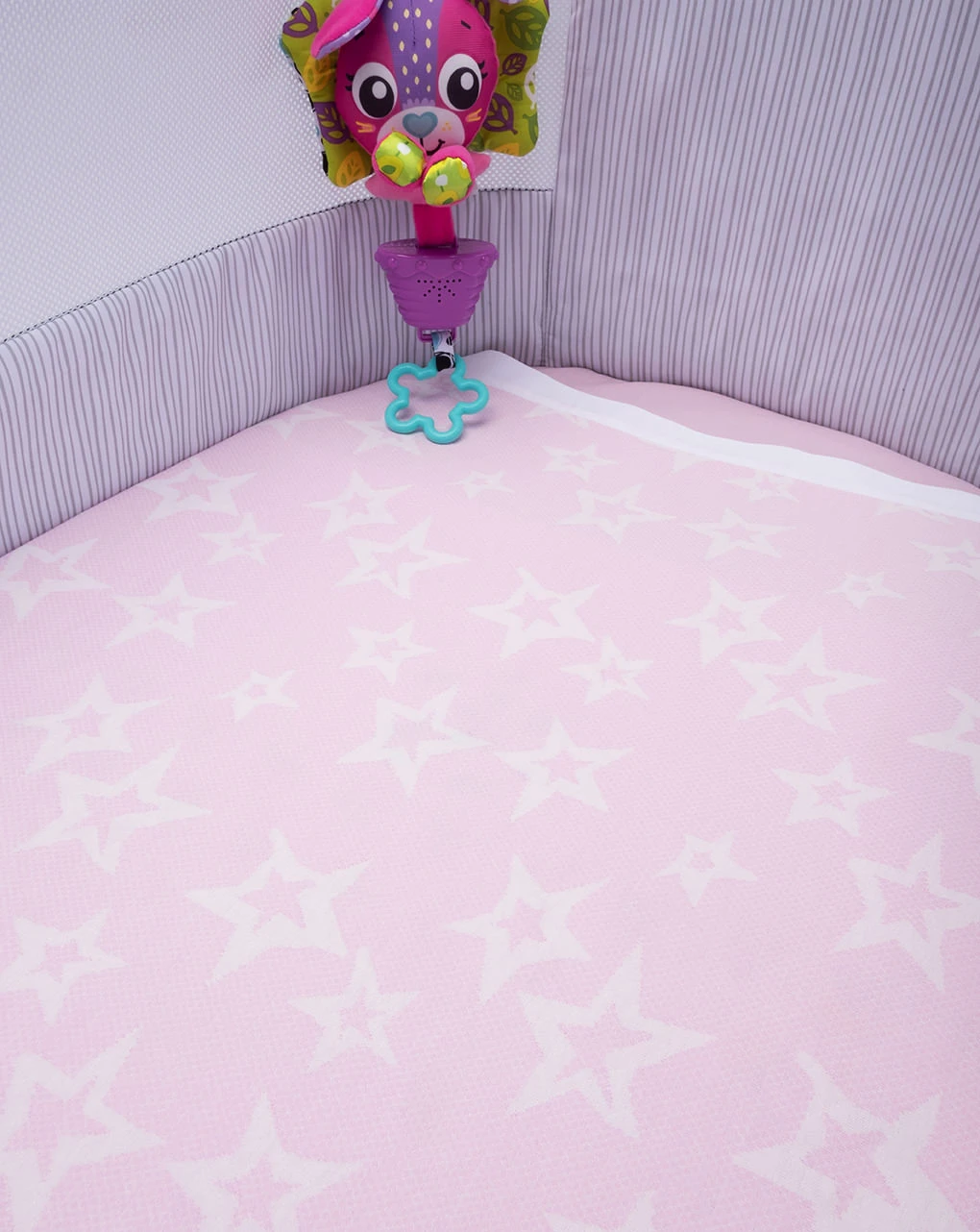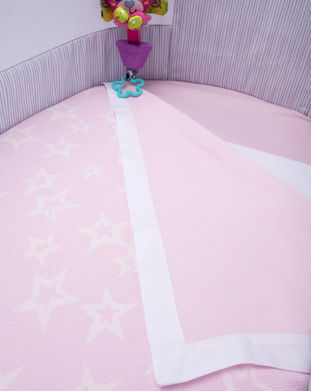 Tenera coperta culla estiva jersey da bambina in 100% cotone. Il capo si sviluppa su sfondo rosa chiaro in tinta unita da un lato e con stampa allover di stelle in tonalità white dall’altro. La coperta è pratica, confortevole e garantisce una temperatuta ottimale. Accessori non in vendita. La confezione contiene solo il capo d’abbigliamento. Dimensione: 70×80 cm