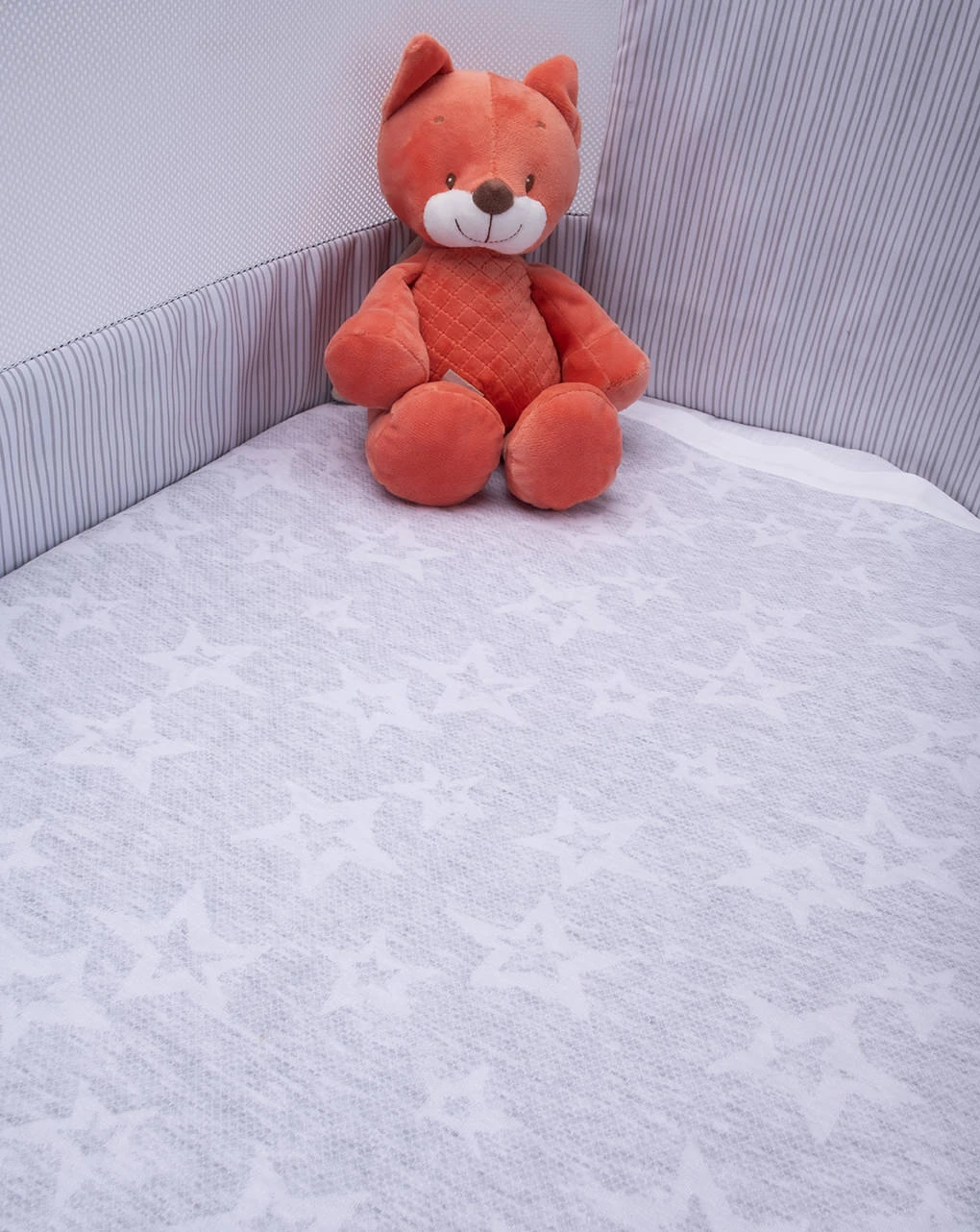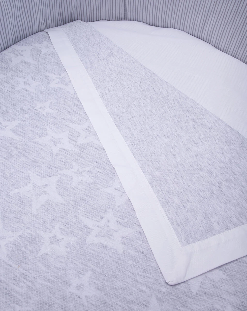 Tenera coperta culla estiva jersey unisex in 100% cotone. Il capo si sviluppa su sfondo grigio chiaro in tinta unita da un lato e con stampa allover di stelle in tonalità white dall’altro. La coperta è pratica, confortevole e garantisce una temperatura ottimale. Accessori non in vendita. La confezione contiene solo il capo d’abbigliamento. Dimensione: 70×80 cm