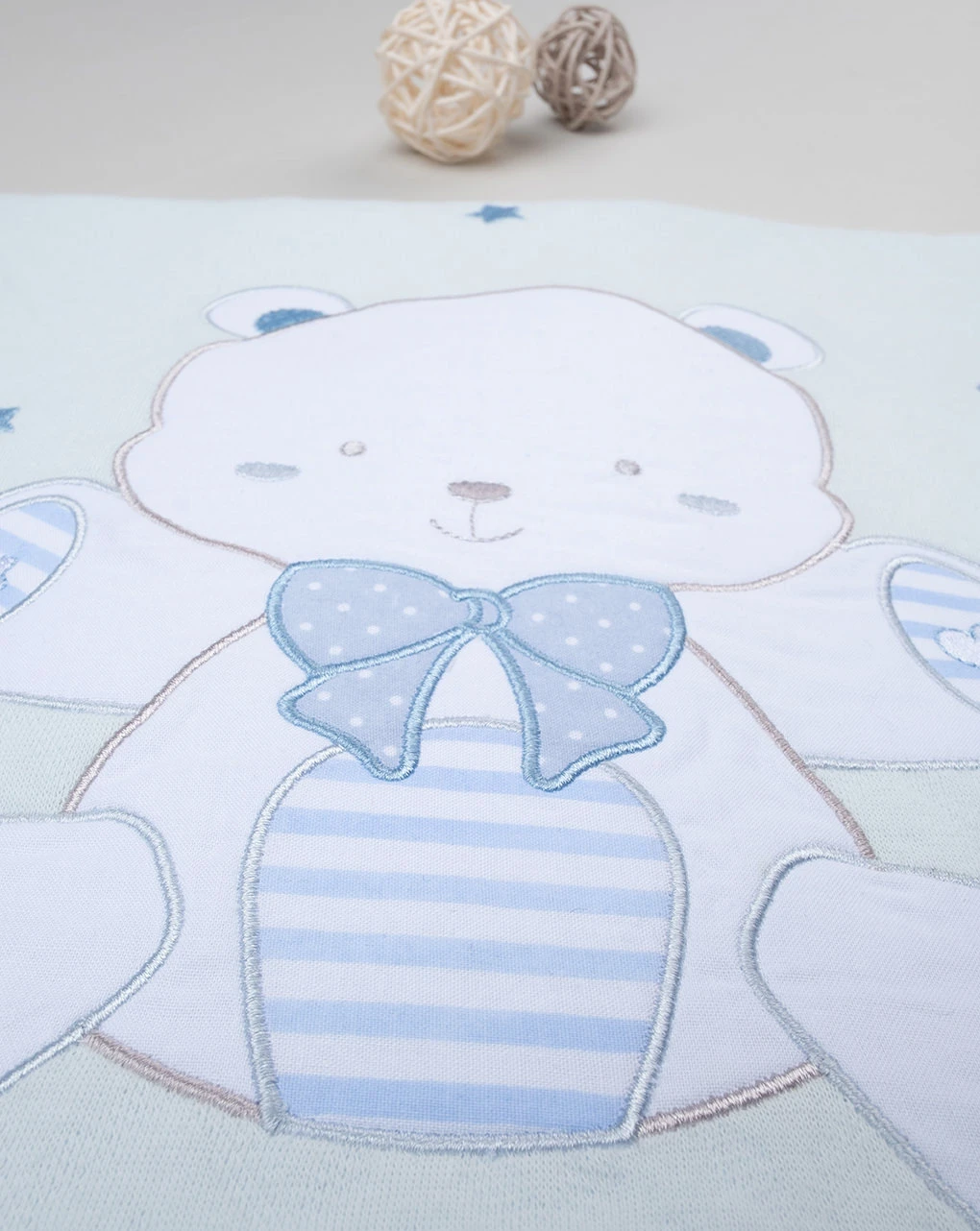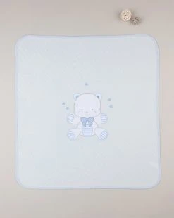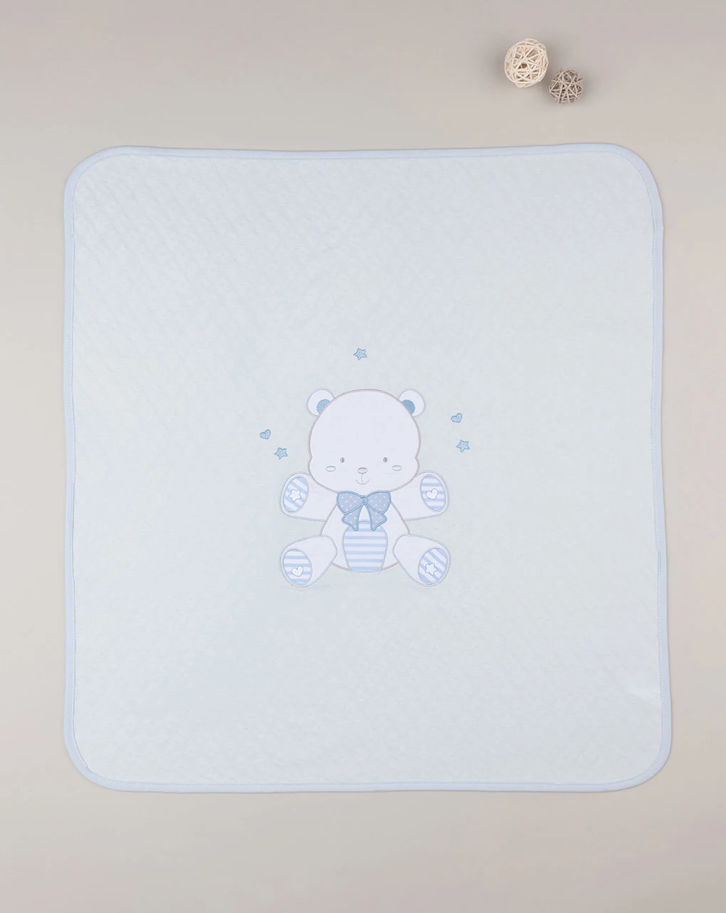 Morbida copertina da neonato in pelliccetta azzurra. Il capo si sviluppa in colore azzurro cielo e ha un orsetto nella parte frontale. Bordi rifiniti. Misure : 70×80 cm.