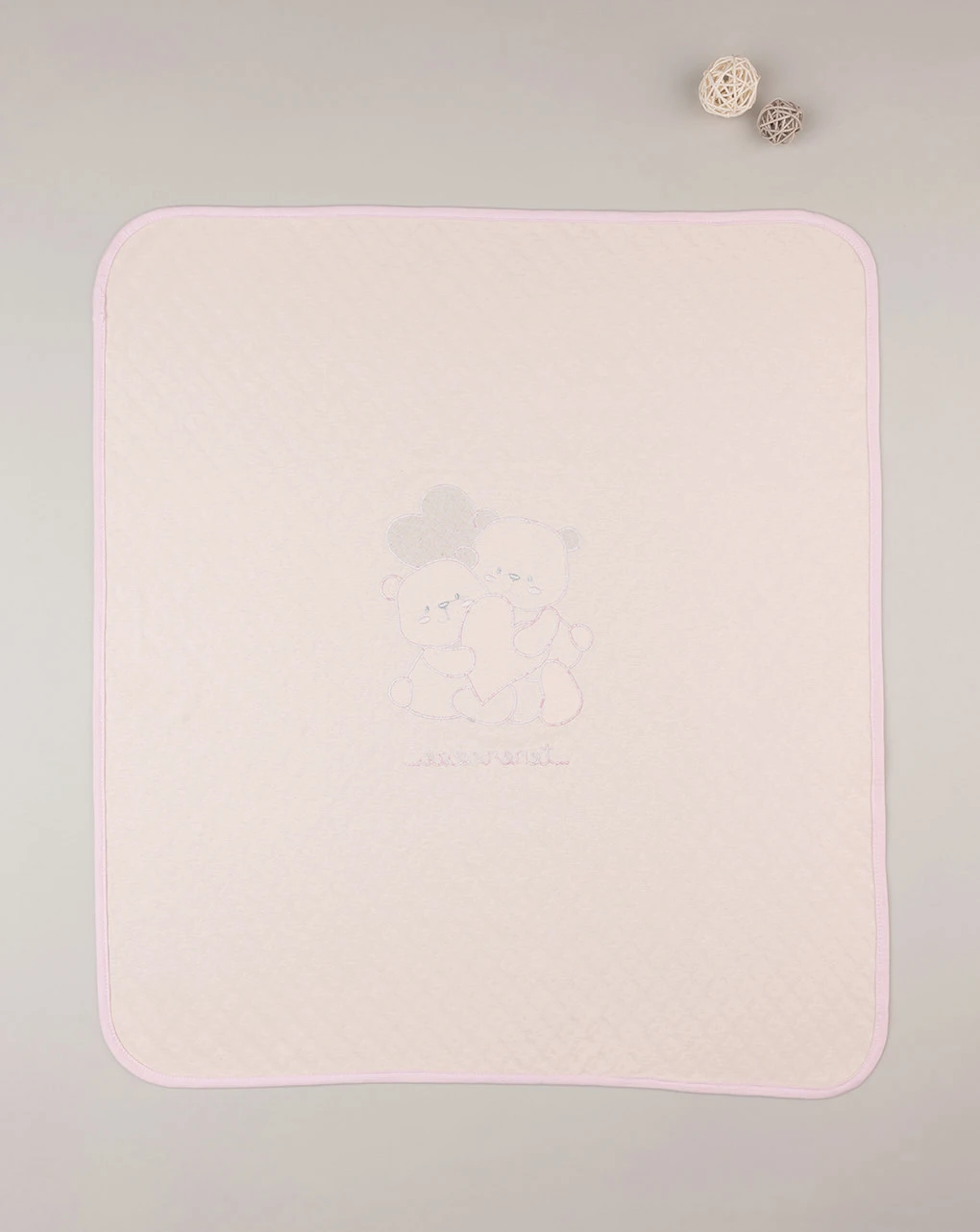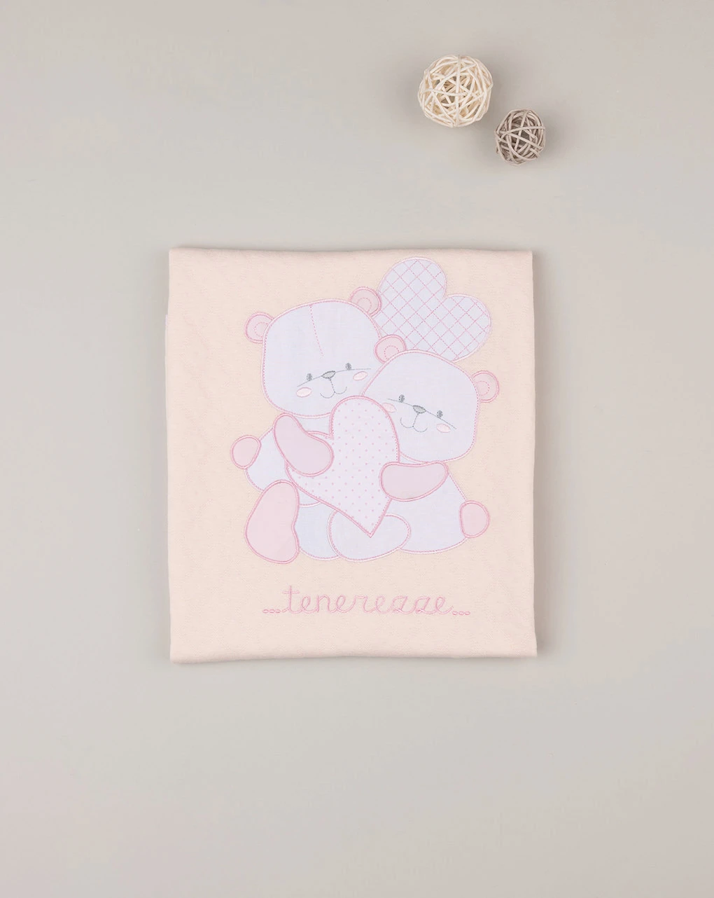 Morbida copertina da neonato in pelliccetta rosa. Il capo si sviluppa in colore rosa e ha un orsetto nella parte frontale. Bordi rifiniti. Misure : 70×80 cm.