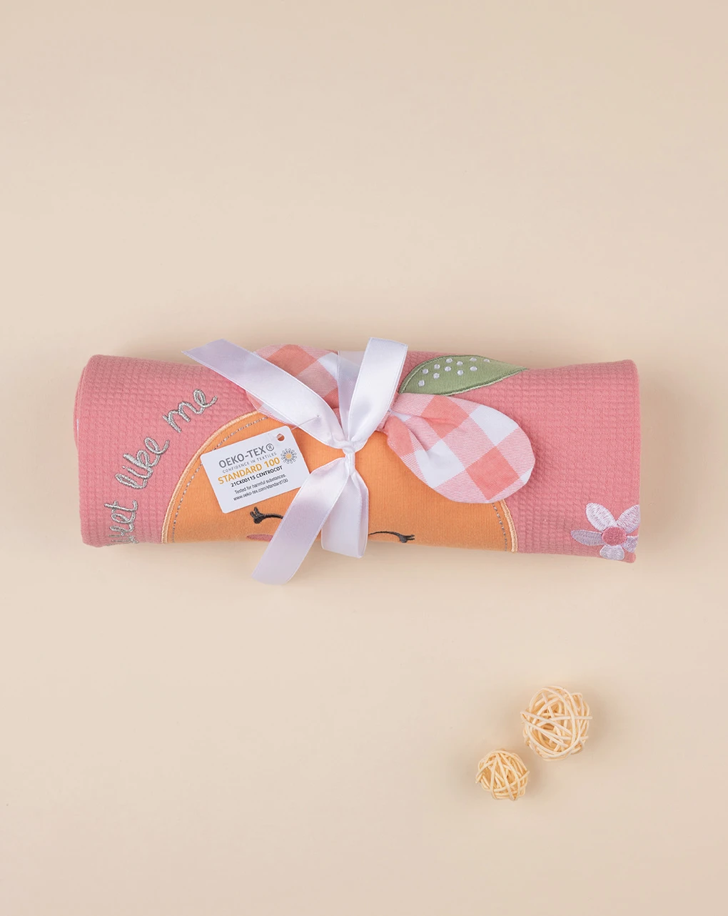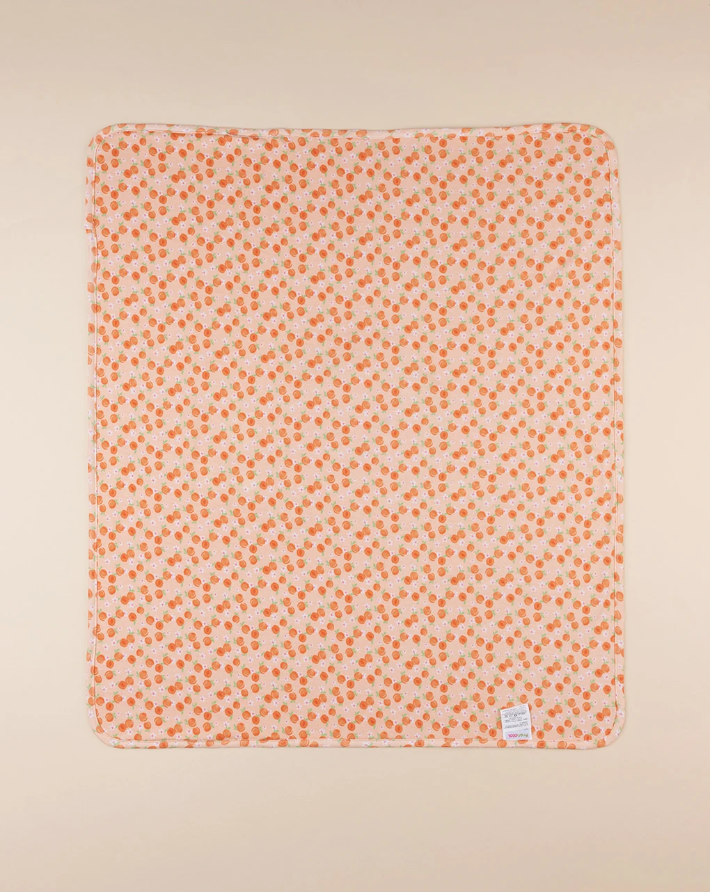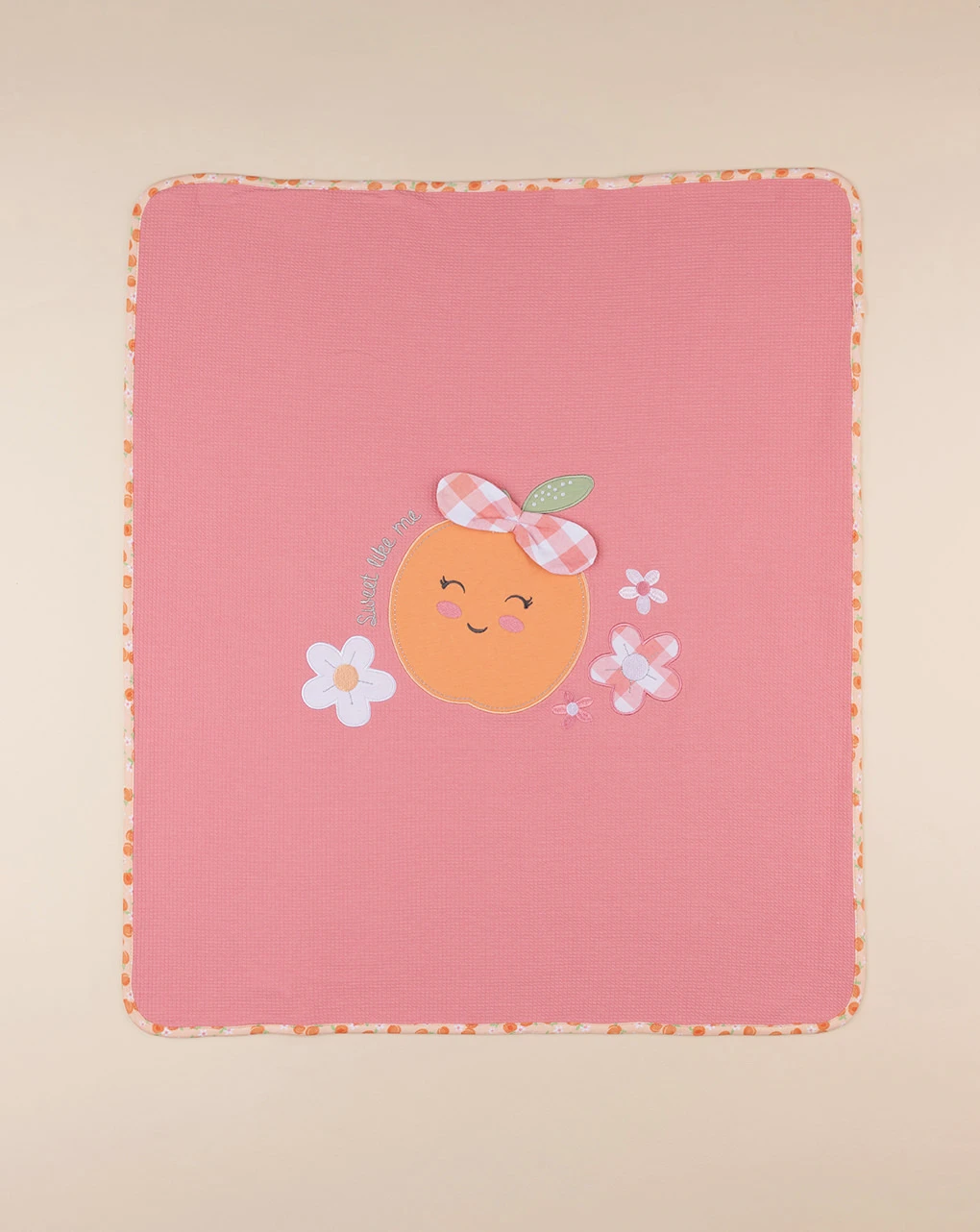 Tenera coperta da culla per neonata. La coperta su sviluppa in color pesca ed è arricchita da immagine centrale a tema frutta. Retro decorato in fantasia allover su sfondo bianco. Venduta arrotolata con fiocco come chiusura. Accessori non in vendita. La confezione contiene solo il capo.