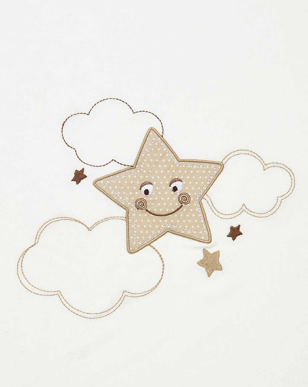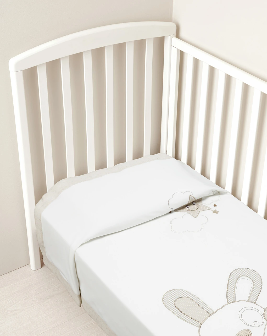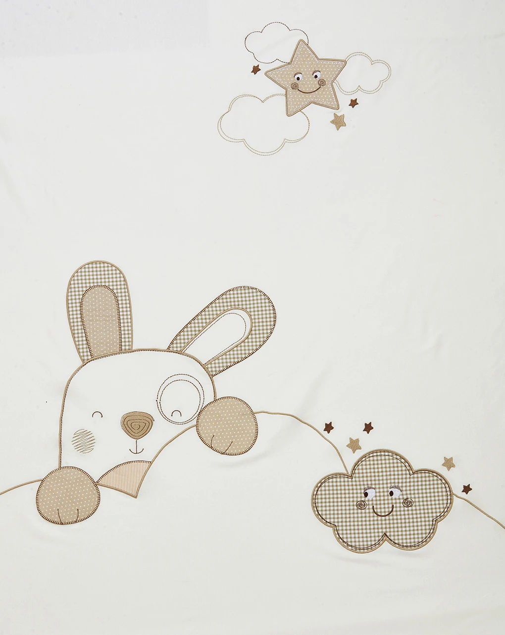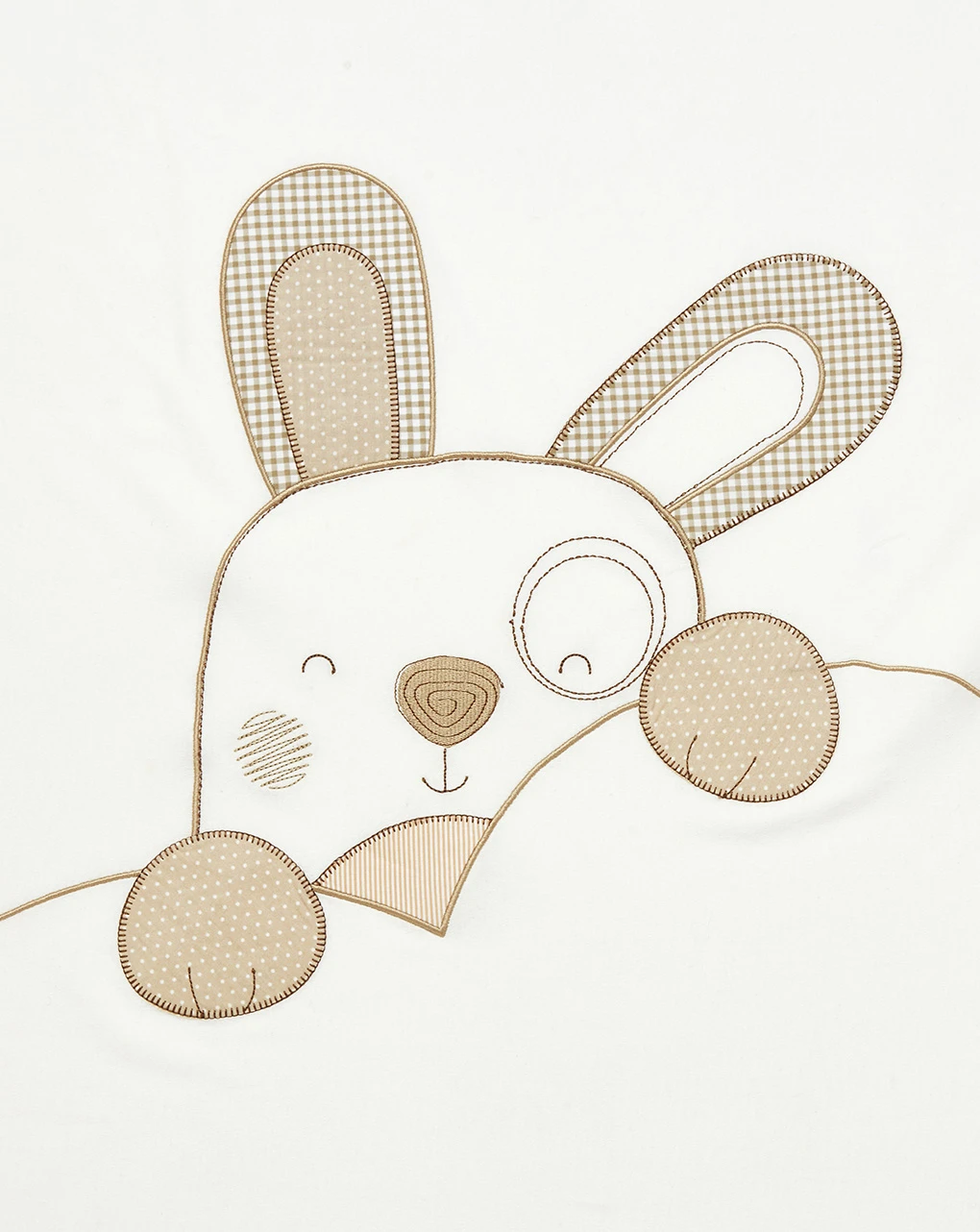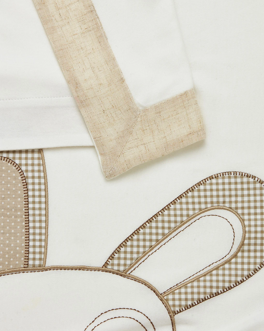 Calda copertina letto realizzata in morbido cotone con dettagli in lino. Il capo è di colore bianco ed è decorato sul fronte dal ricamo di un grande cagnolino con dettagli patch nei toni del beige. Un bordo il lino beige completa la coperta. Dimensioni: 110×145 cm
