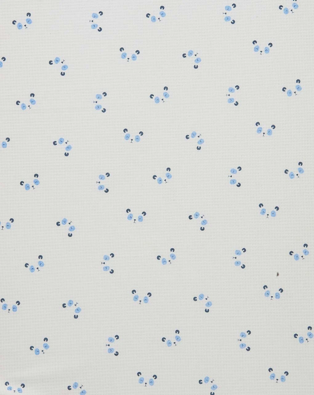 Tenera copertina a nido d’ape in cotone bianco. Il capo è decorato dalla stampa allover di piccoli musi di orsetto realizzati nei toni del blu. Dimensione: 100×120 cm
