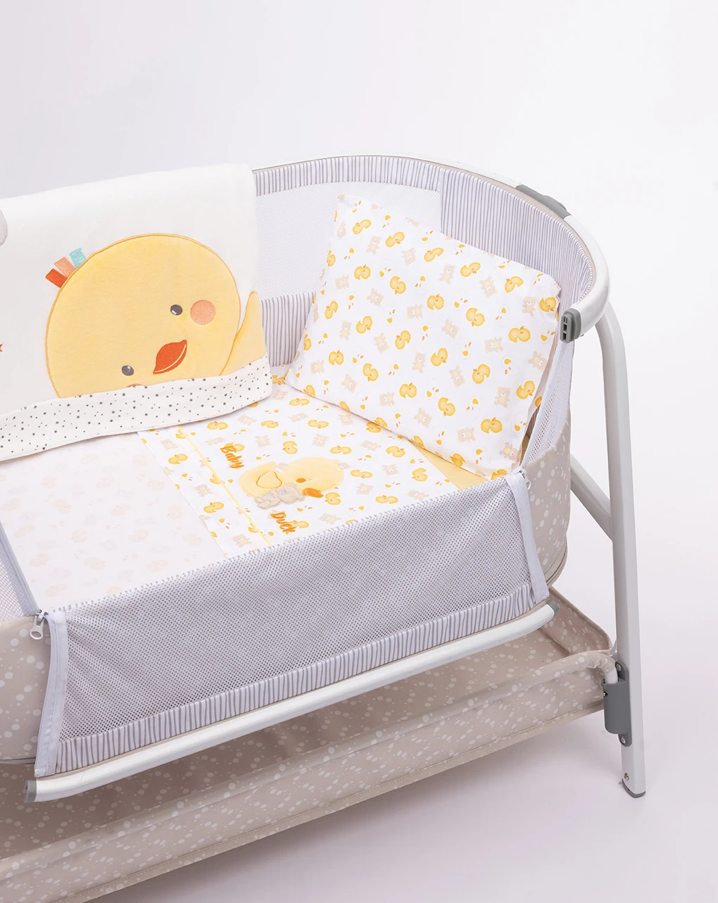 Tenero set composto da tre pezzi. Il lenzuolino di sotto è giallo tinta unita, il secondo lenzuolino è decorato da un lato con una fantasia allover a tema paperelle e presenta una maxi paperella sul bordo. La federa presenta una fantasia uguale a quella presente sul secondo lenzuolino. Dimensioni: Lenzuolo sotto cm 80*110 cm Lenzuolo sopra cm 80*110 cm Federa 26*36 cm