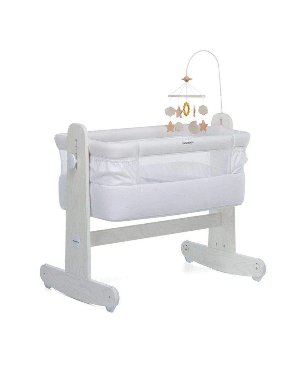 Culla dal design classico e raffinato, ideale per le prime nanne grazie alle funzioni dondolo, co-sleeping e anti-reflusso.