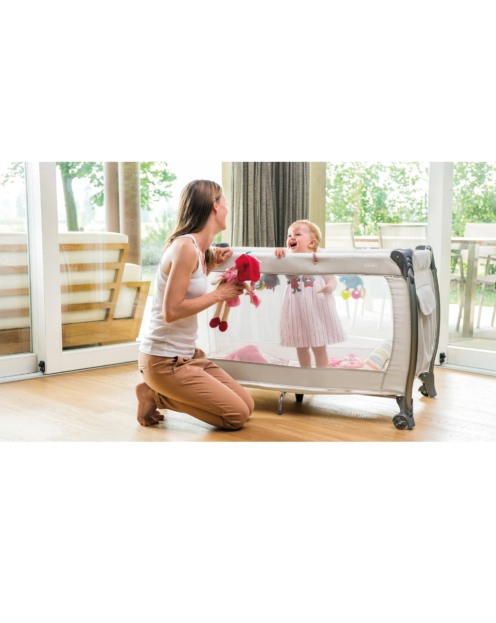 Facilita il posizionamento del bambino grazie all’oblò laterale apribile a zip. Può essere utilizzato come box giochi per i bambini più grandi. Si sposta facilmente all’interno della cameretta grazie alle ruote.