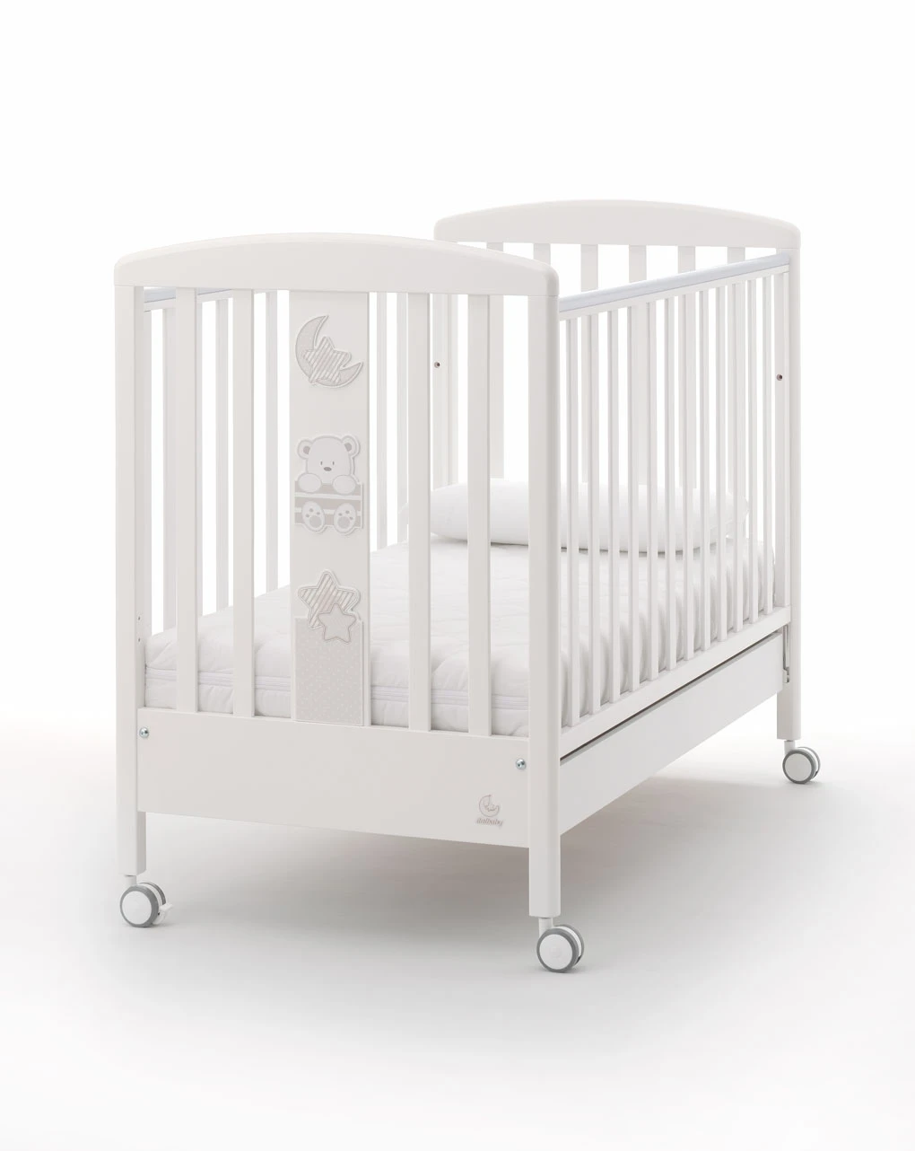 Lettino My Teddy con stile romantico e teneri decori per la sua nanna. Lettino con struttura in faggio, con vernici atossiche a base acqua, spondine mobili con guaina superiore antimorso. Rete a doghe e cassetto con doppio scompartimento. 4 ruote piroettanti gommate antigraffio di cui due con freno. Misure in cm 130x70x103 in vendita separatamente materasso 62 x 125 cm