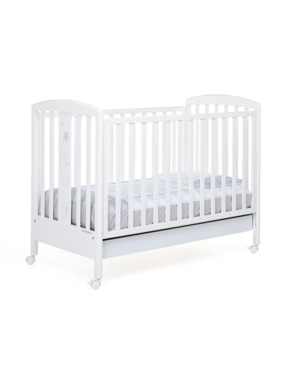 Lettino con 1 sponda regolabile e 1 fissa.Una testata con stecca decorata con serigrafia. E’ dotato di 4 ruote piroettanti di cui 2 con freno e un ampio cassetto, rete a doghe, distanza tra le stecche a normativa europea e verniciato con colori atossici. La struttura in legno massiccio di faggio verniciato, la rete reggimaterasso in legno massiccio di faggio, il cassetto di legno truciolare ricoperto di PVC e le ruote in nylon. Dimensioni: h103 x 71 x 131