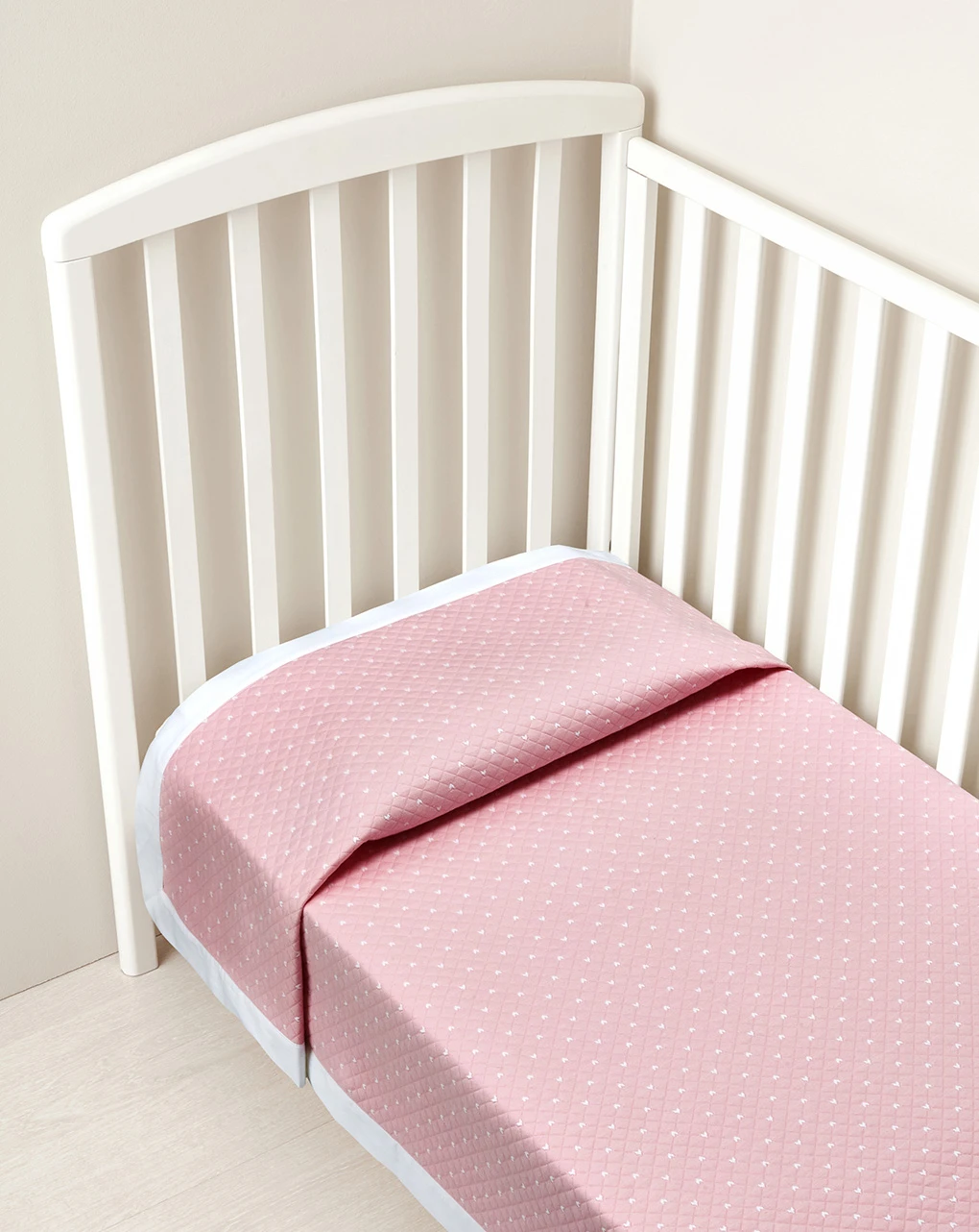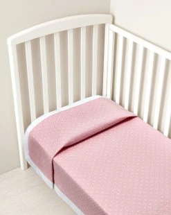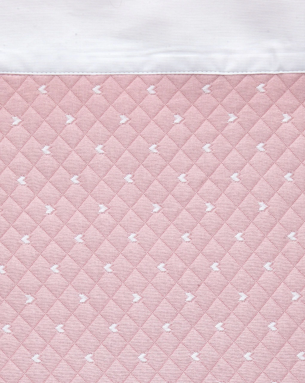 Romantica coperta letto estiva trapuntata di colore rosa con bordo in cotone bianco e piccoli cuoricini bianchi. Dimensioni: 100*120 cm