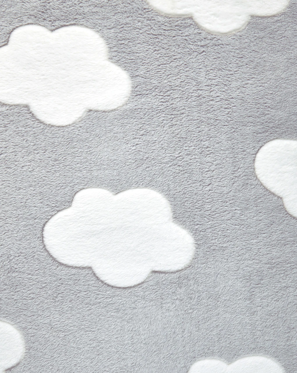 Morbida coperta per letto in finta pelliccetta grigio chiaro con grandi nuvole bianche. Dimensioni: 100×120 cm
