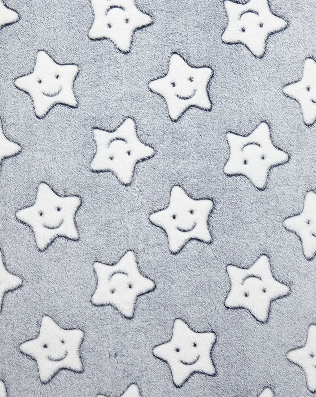 Calda copertina letto in pile blu decorata si ambo i lato da stelle sorridenti. Dimensioni: 100*120 cm