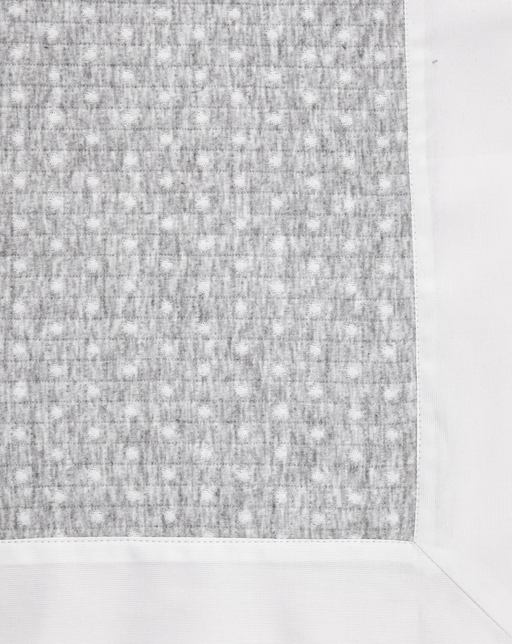 Copertina letto estiva realizzata in morbido cotone grigio chiaro mélange con pois bianchi. Un bordo in tinta unita bianca finisce l’accessorio Dimensioni: 100*120 cm