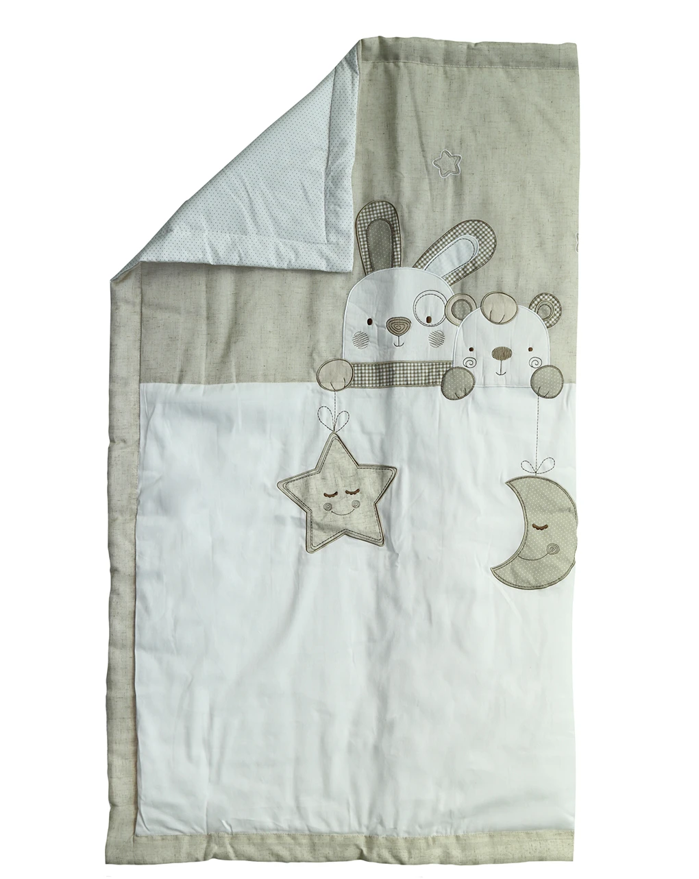 Calda trapunta imbottita per lettino. Un lato della copertina è di colore bianco con piccoli pois. L’altro leto è realizzato in due tessuti differenti. Cotone bianco e lino beige ed è decorato con l’applicazione della patch di un tenero coniglietto che tiene una stella. Dimensioni: 110*140 cm
