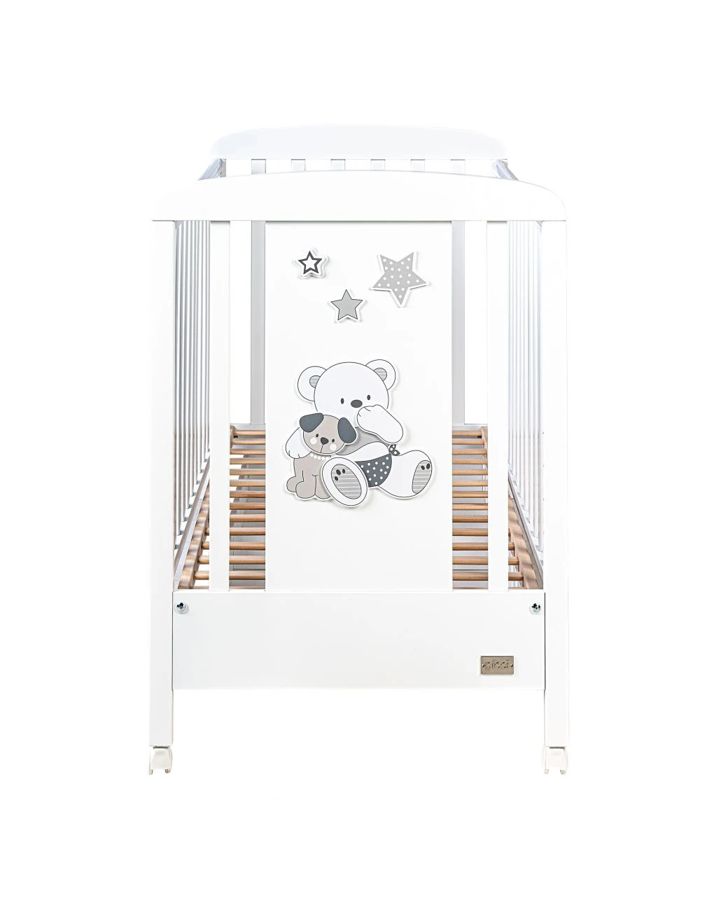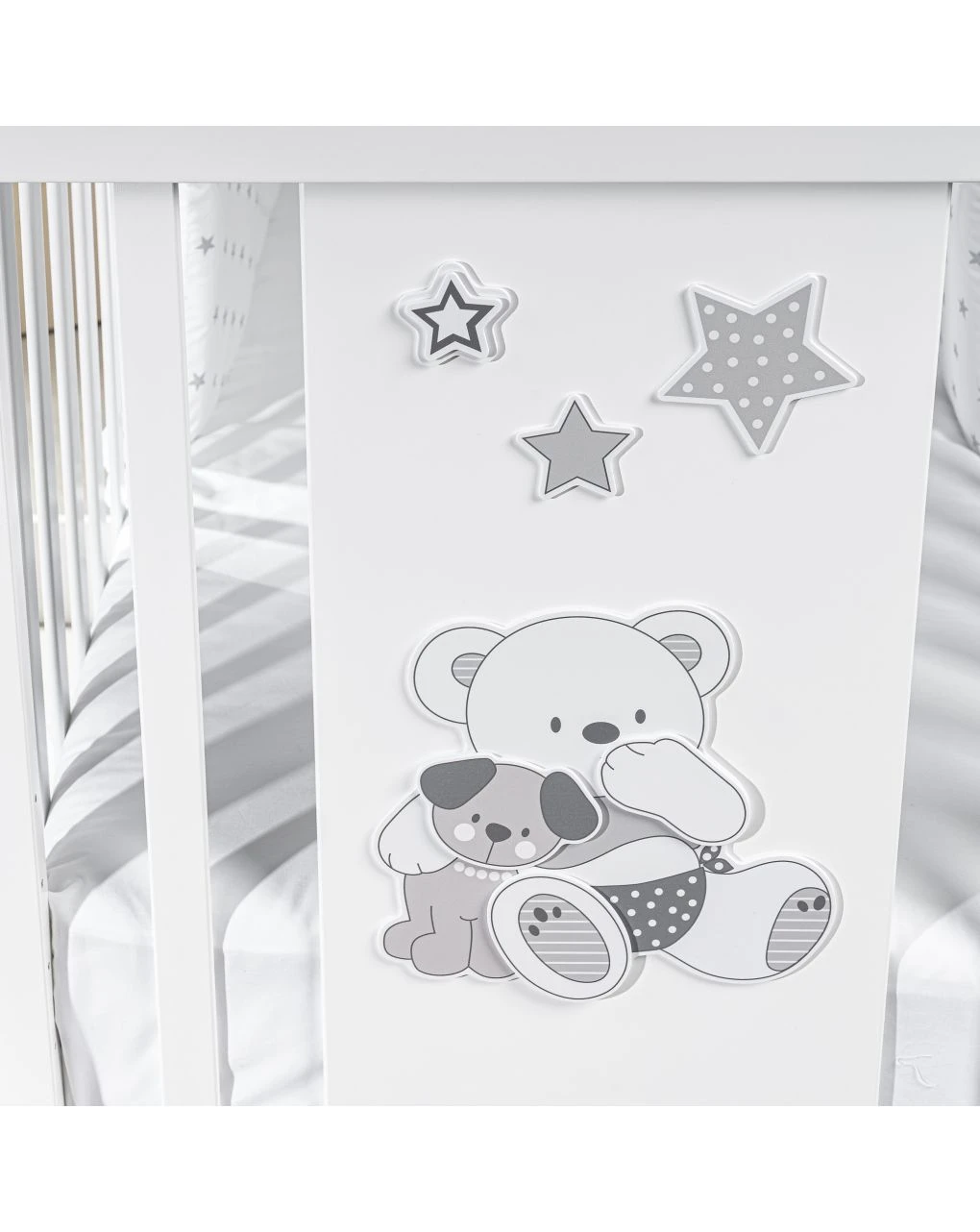 Letto legno Bianco con pannello decorato orso VALDO Grigio, 1 sponda mobile, con bordo salvamorso, con rete doppia altezza (kit incluso). Cm 70x130xh. 100