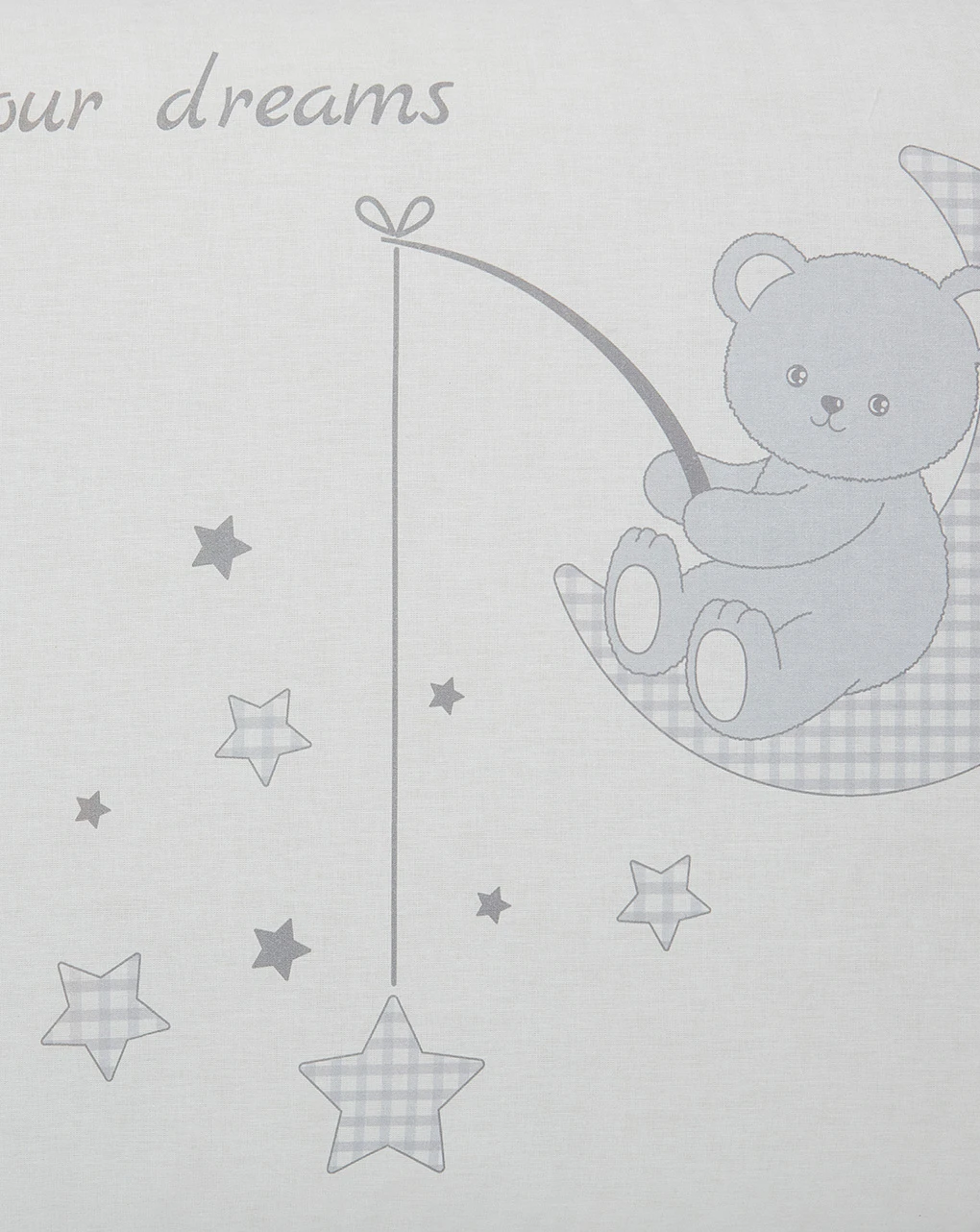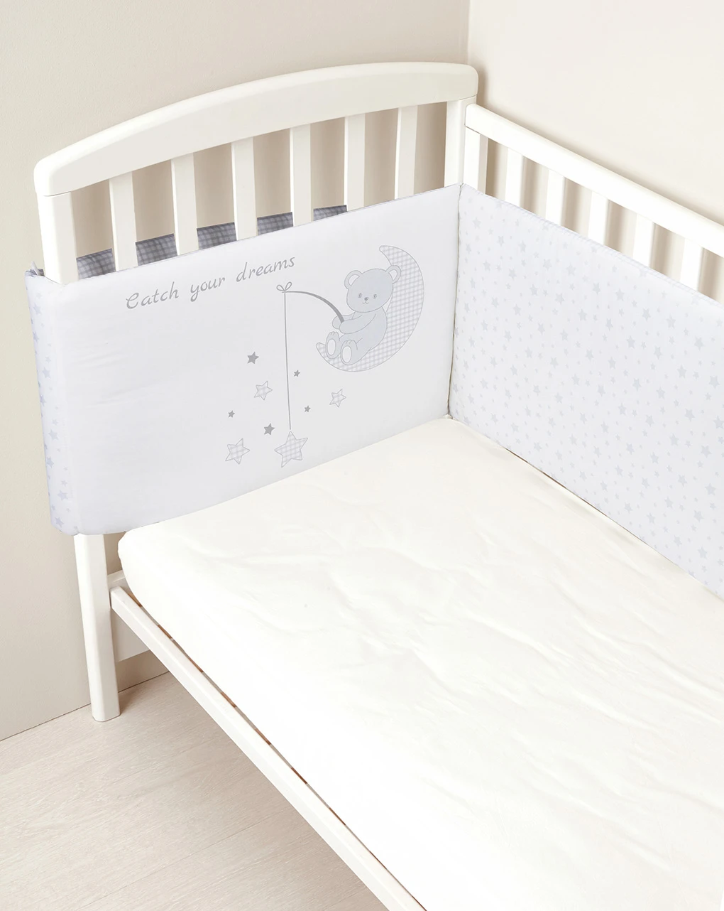 Romantico paracolpi in tessuto bianco con dettagli grigio. L’accessorio è decorato dalla stampa di un tenero orsetto seduto sulla luna che pesca stelle. Paracolpi con lacci. Dimensioni: 195x40cm