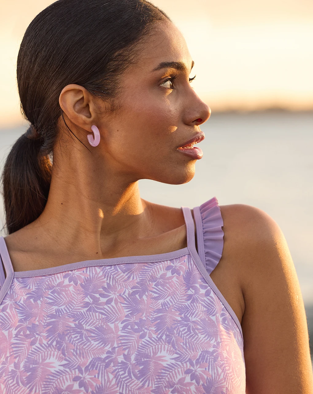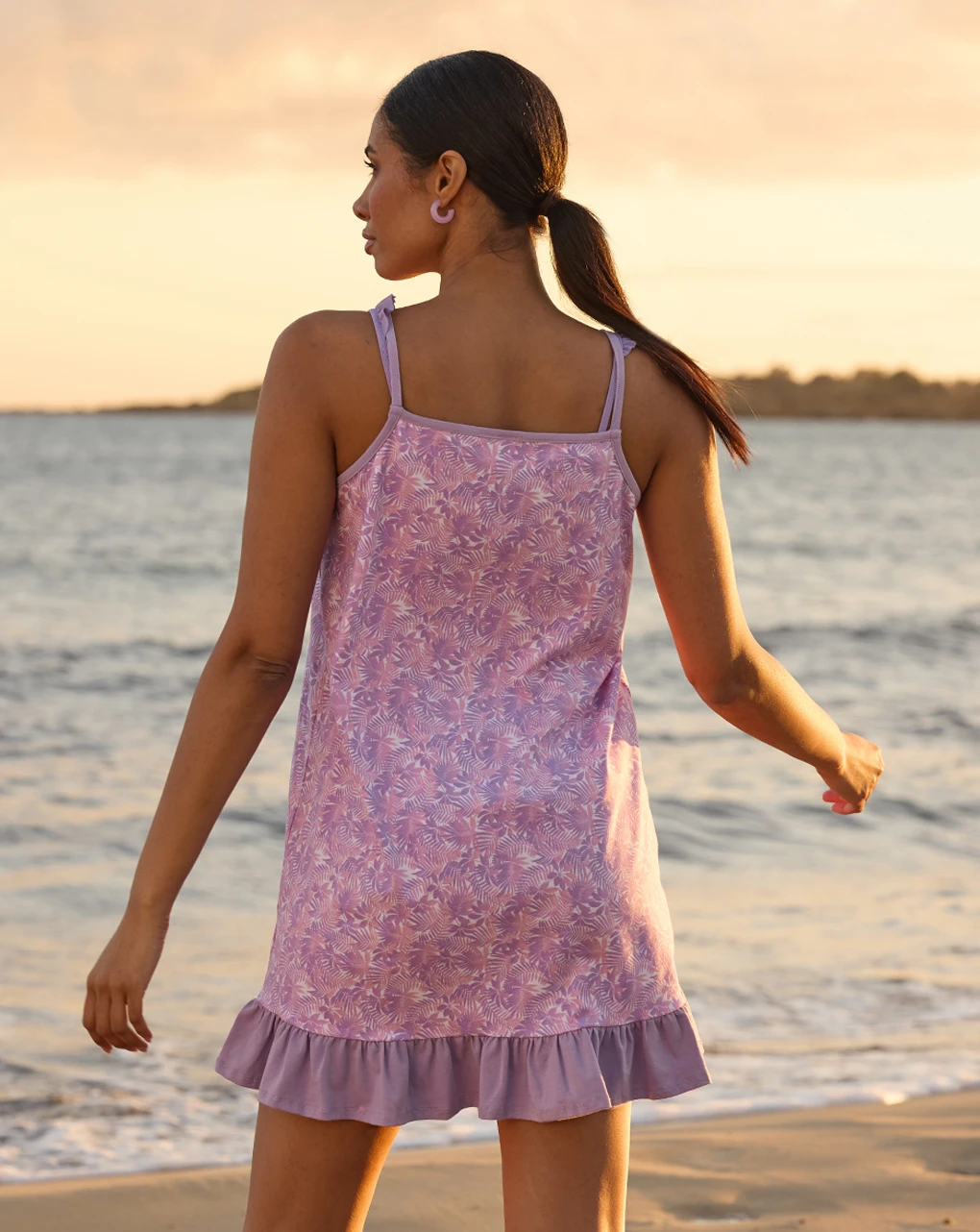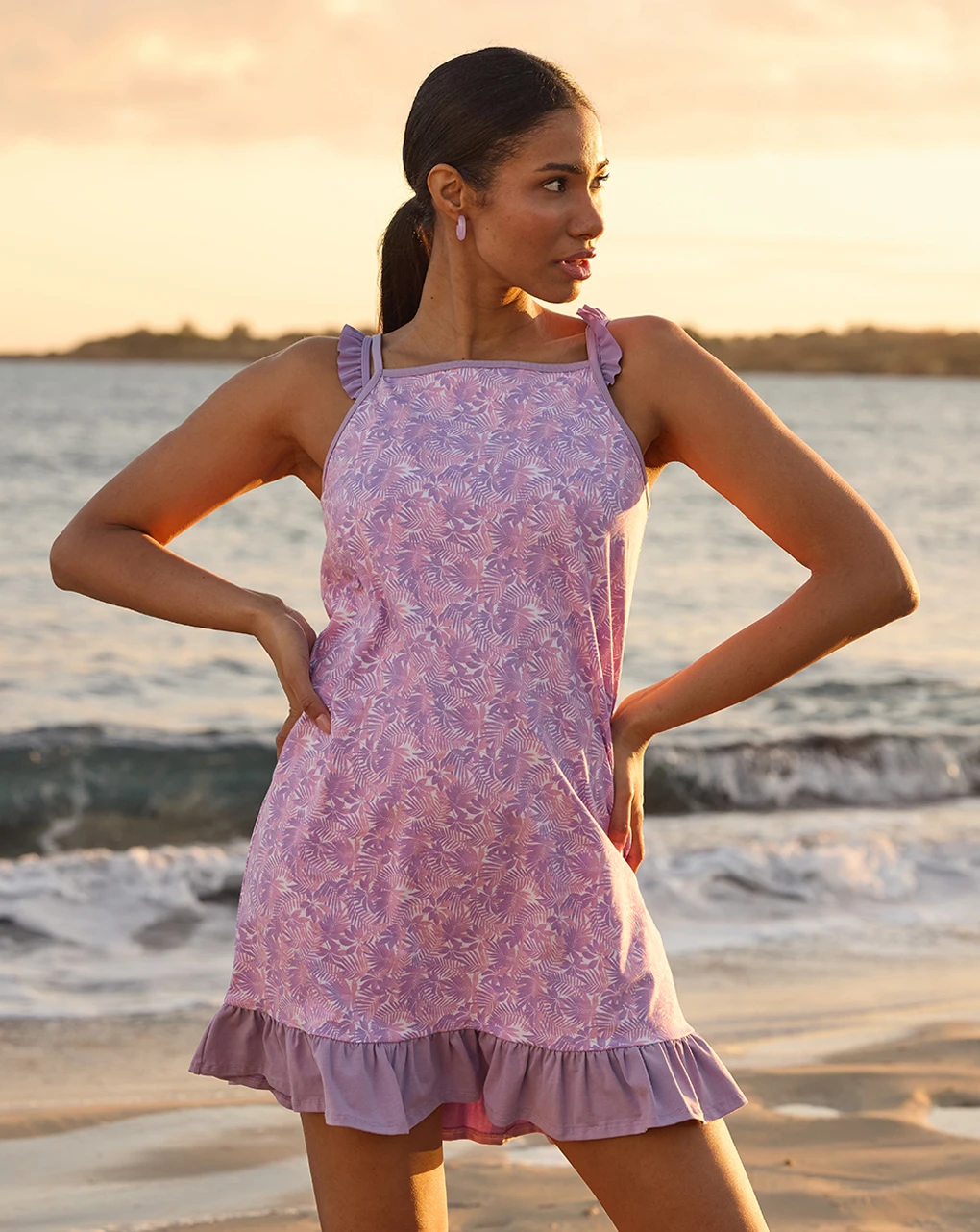 Abito copricostume premaman pensato per essere abbinato al costume della stessa linea. Il capo si sviluppa con fantasia allover nei toni del rosa e del lilla. Bordi e rouches all’estremità lilla tinta unita. Modello ampio e confortevole. L’abito appartiene alla linea Mini Me che comprende anche lo stesso capo per baby e kid girl