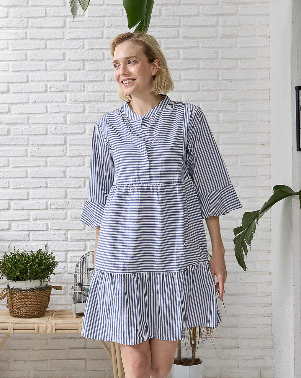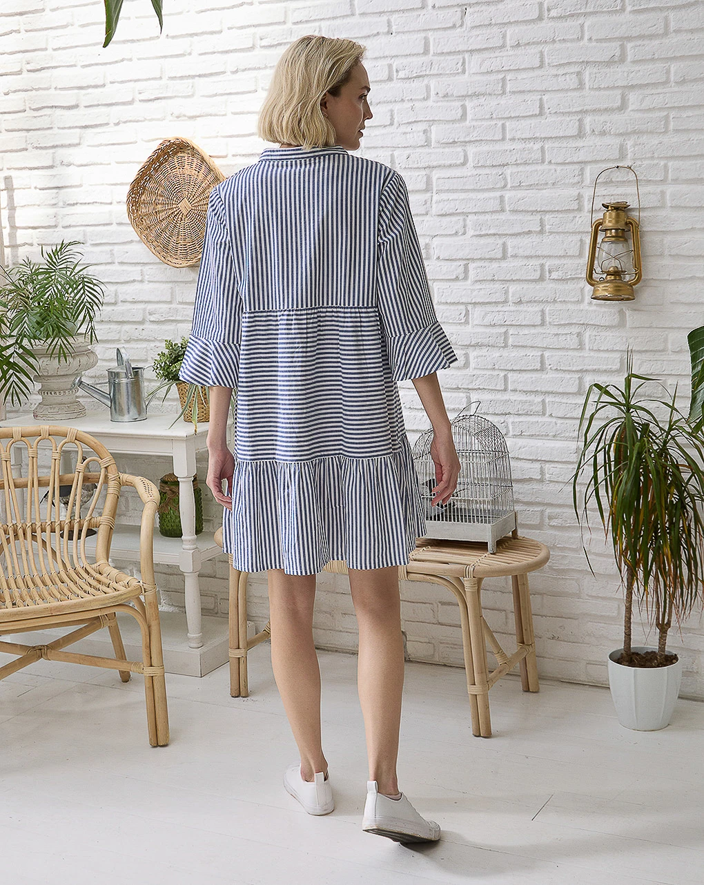 Abito premaman in cotone con fantasia a righe bianche e blu dal gusto marinière. Dalla linea ampia e svasata, è molto comodo da indossare durante la gravidanza. La chiusura con bottoni sul davanti permette anche di allattare in totale comfort.
