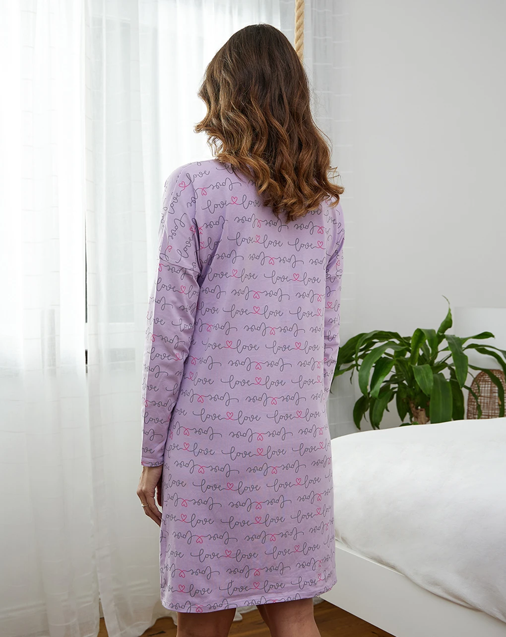 Camicia da notte allattamento color rosa lavanda in jersey dalla qualità elastica, che assicura una vestibilità morbida e confortevole, adattandosi all’evoluzione naturale della pancia durante tutta la gravidanza. Il capo presenta una chiusura parziale con bottoni, che permette di essere indossato comodamente anche durante l’allattamento. La stampa Love all over dona aggiunge un tocco romantico.