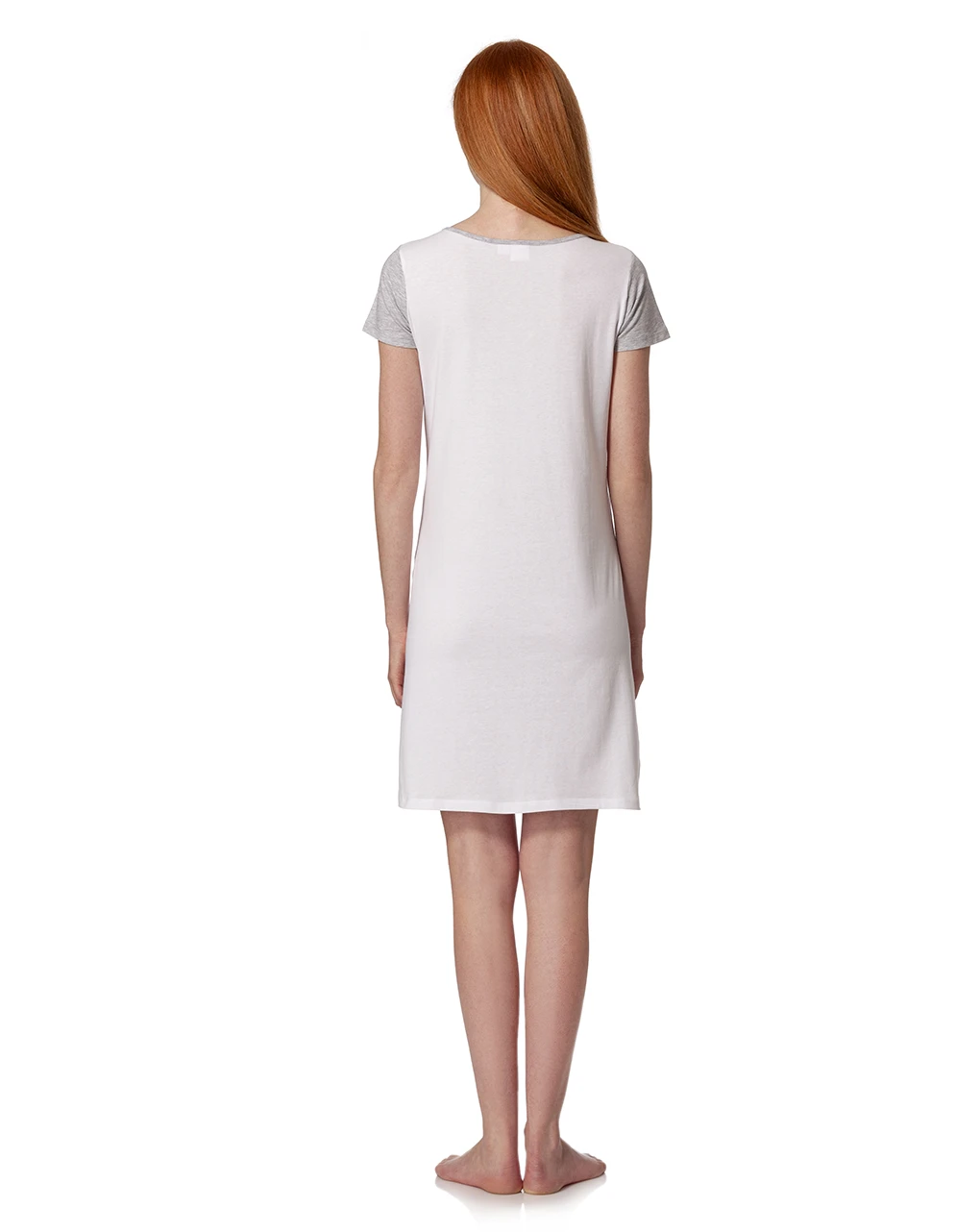 Classica camicia parto bianco panna con mezze maniche, collo ampio leggermente a cuore e cannoncino color grigio chiaro mélange. Aperta sul davanti con bottoni ad asola in simil madreperla.
