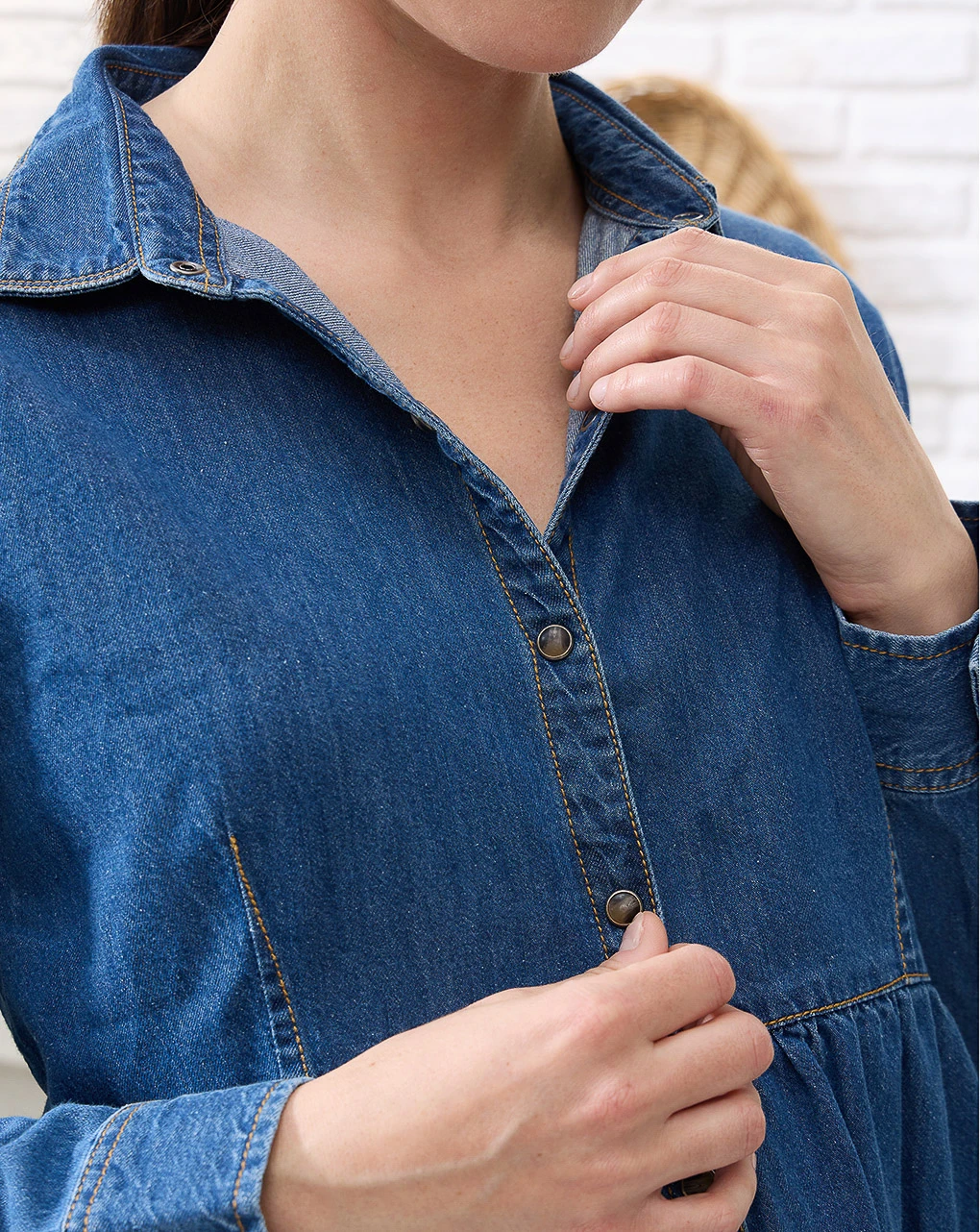 Camicia premaman allattamento in total blu denim. La linea ampia e svasata rende il modello perfetto da indossare durante la gravidanza. La pratica chiusura con bottoni permette di allattare in totale comfort.