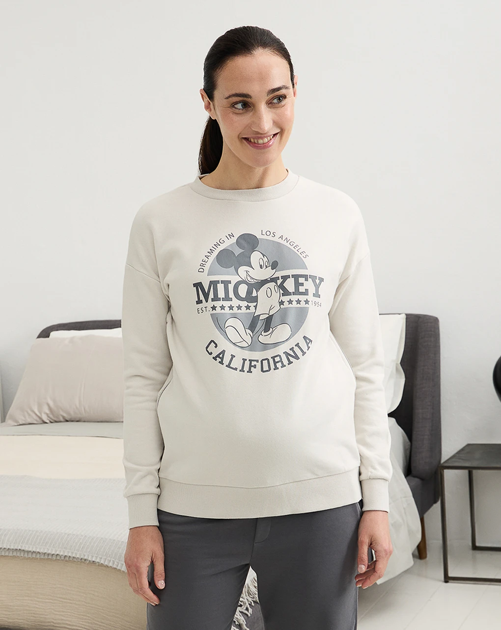 Felpa premaman con stampa Mikey Mouse sul davanti, dalla vestibilità molto confortevole. Il capo è dotato di due zip laterali che, oltre a regolare la vestibilità durante tutta la gravidanza, permettono alle neo mamme di allattare in tutta comodità.