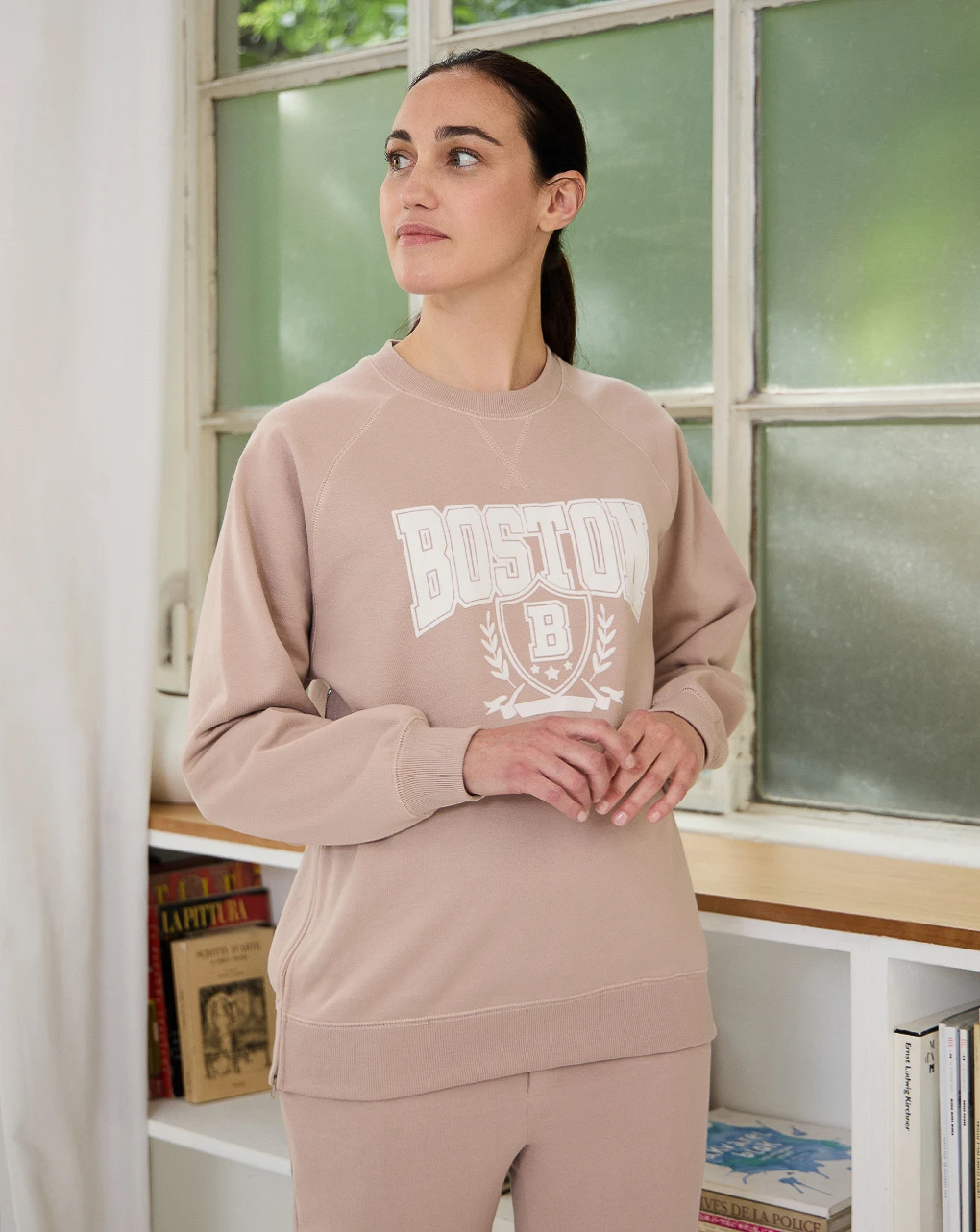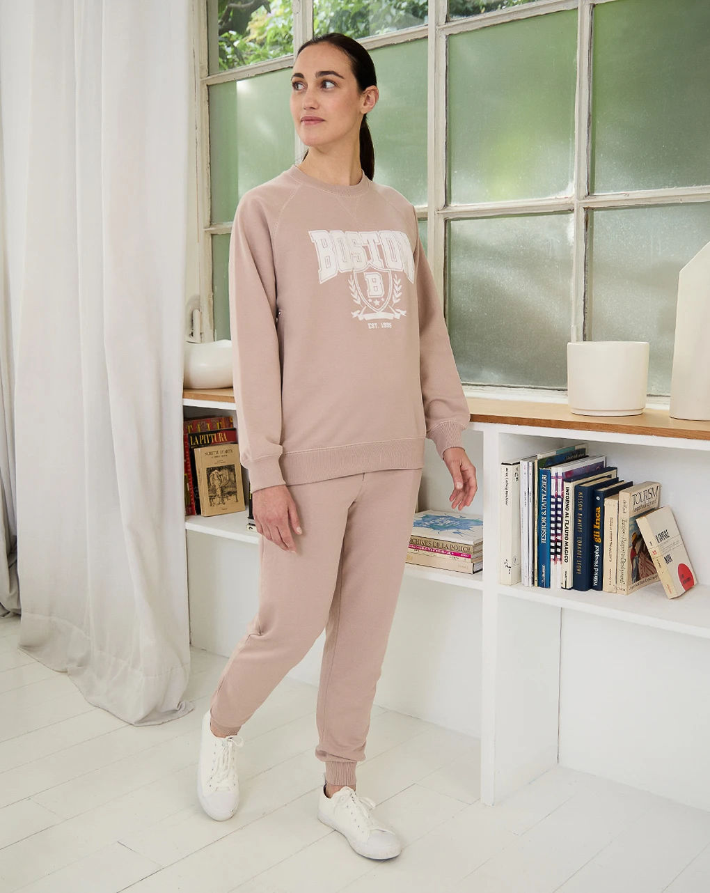 Felpa premaman color rosa cipria con stampa “Boston” in stile University sul davanti, dalla vestibilità molto confortevole. Il capo è dotato di due zip laterali che, oltre a regolare la vestibilità durante tutta la gravidanza, permettono alle neo mamme di allattare in tutta comodità. Per un completo monocromo, abbinala al pantalone in felpa nella stessa tonalità.