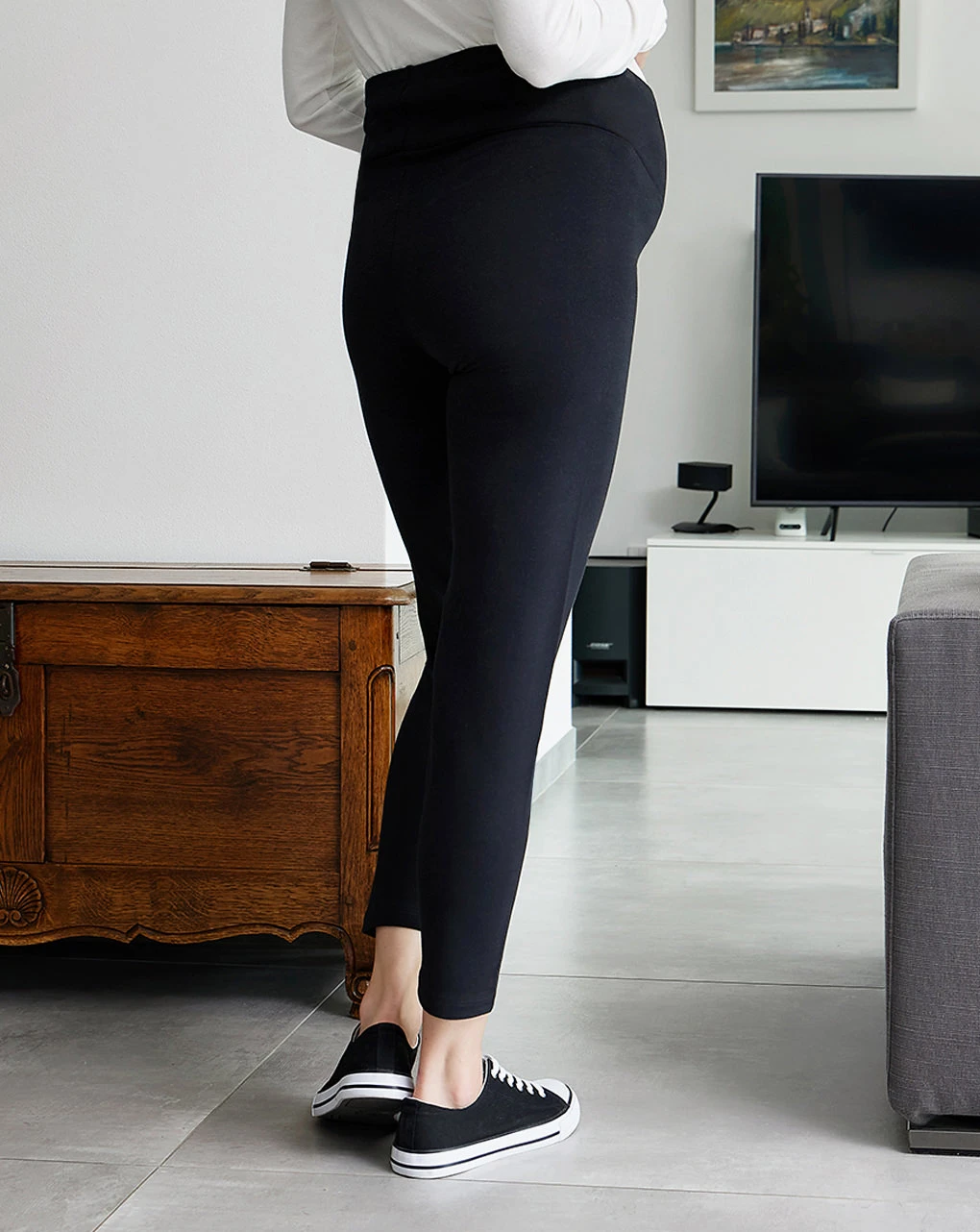 Leggings premaman nero in french terry, tessuto più leggero di una felpa, ma più pesante dei tessuti estivi. La fascia in vita lavorata a costine ha un elastico interno che garantisce alla futura mamma comfort ottimale e libertà di movimento durante tutta la gravidanza.