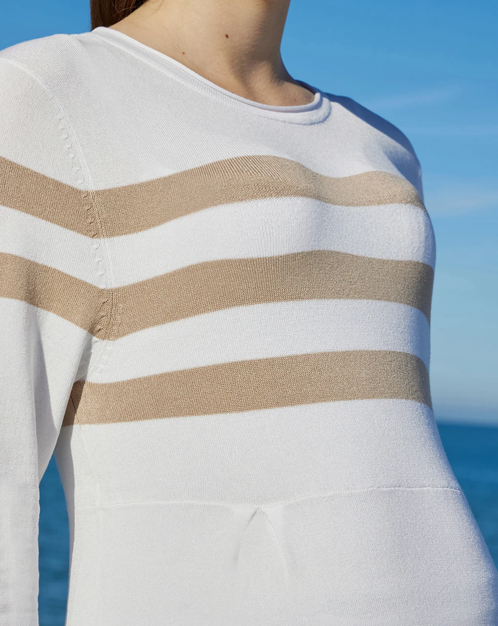 Morbido maglioncino premaman bianco con righe orizzontali color oro sulla parte alta. Piccole contropieghe in vita enfatizzano la linea più ampia e svasata della parte inferiore, che assicura una vestibilità super confortevole durante tutta la gravidanza.