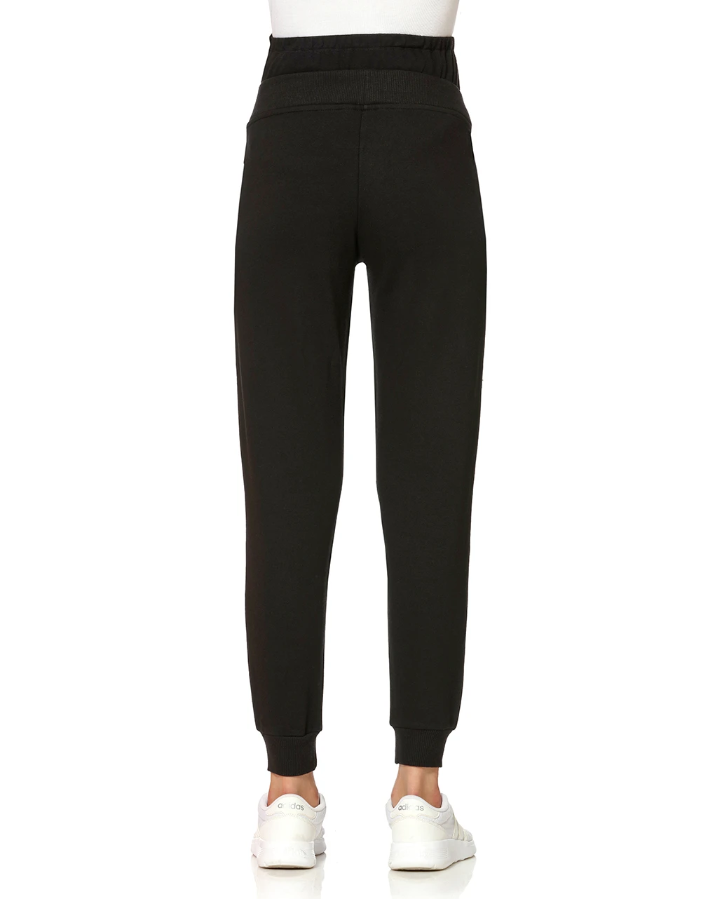 Comodo pantalone in felpa nera. Il capo è dotato di fascia regolabile in vita, finta coulisse e polsini alla caviglia.