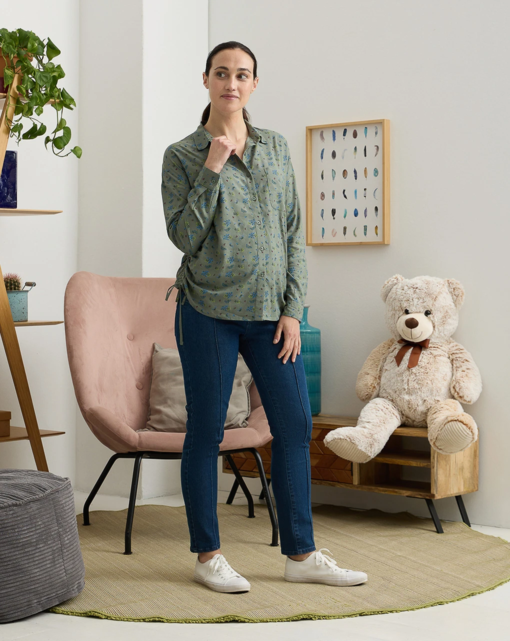 Pantalone premaman in denim blu stretch dalla silhouette slim e confortevole allo stesso tempo. La fascia alta in vita in jersey stretch con elastico interno garantisce alle future mamme il massimo comfort, senza comprimere la pancia durante la gravidanza. Con fascia scucibile, può essere indossato anche dopo il parto.