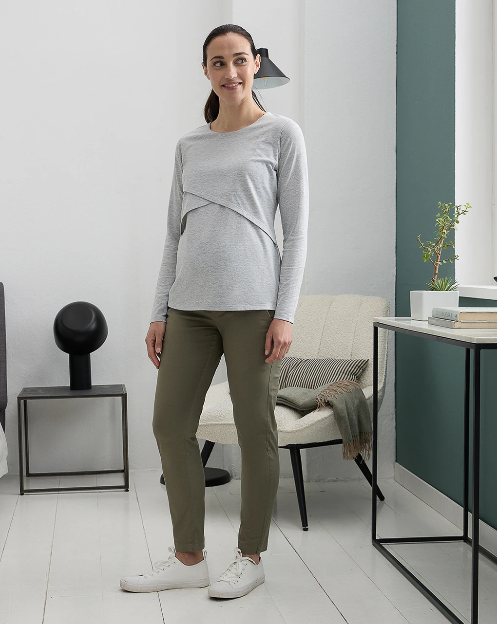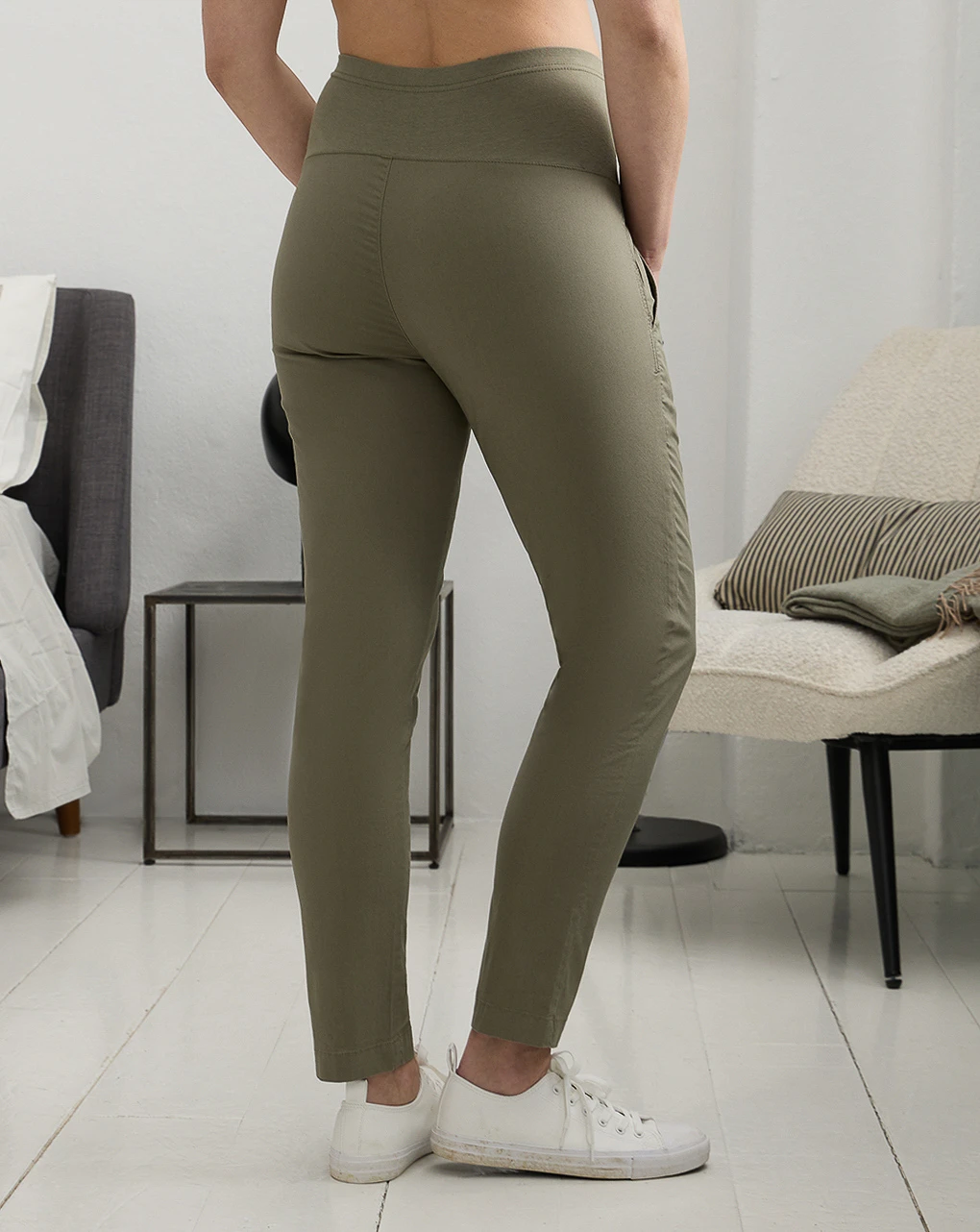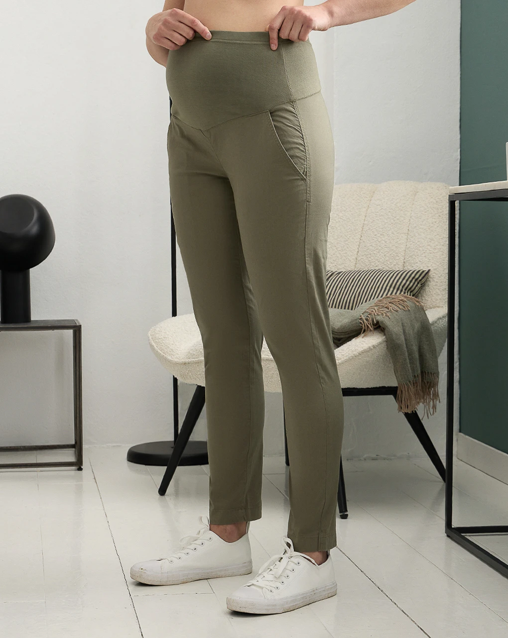 Pantalone premaman in tessuto stretch color verde militare. Il fit è slim e confortevole al tempo stesso. La fascia alta in vita con elastico interno garantisce il massimo comfort, senza comprimere la pancia durante tutta la gravidanza.