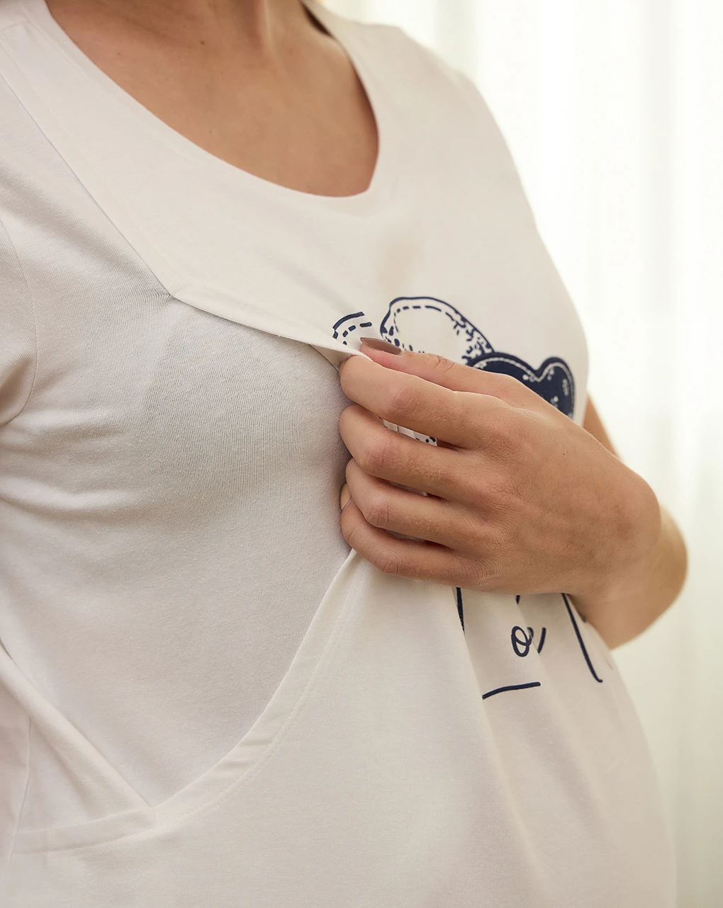 Pigiama allattamento in jersey bianco e blu. Dalla vestibilità comoda e confortevole, è perfetto per essere indossato anche durante la gravidanza. La t-shirt manica corta è caratterizzata dalla stampa cuori con scritta “Love mom” e da pratiche aperture laterali, per allattare in totale comfort. Il pantalone è caratterizzato da un pratico elastico in vita e da una romantica fantasia floreale.