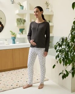 Pigiama premaman in morbido jersey dalla vestibilità morbida e confortevole. La t-shirt presenta maniche lunghe, una piccola tasca sul davanti e una chiusura con bottoni, che permette di indossare il pigiama anche durante l’allattamento. Il pantalone con stampa “Sweet Dreams” all over è caratterizzato da un pratico elastico per un sostegno ottimale durante la gravidanza, senza comprimere la pancia.