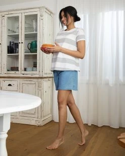 T-shirt mezze maniche allattamento in jersey di cotone con stampa righe bianche e grigie. La vestibilità è ampia e comoda, grazie anche alla qualità del tessuto. Modello girocollo.