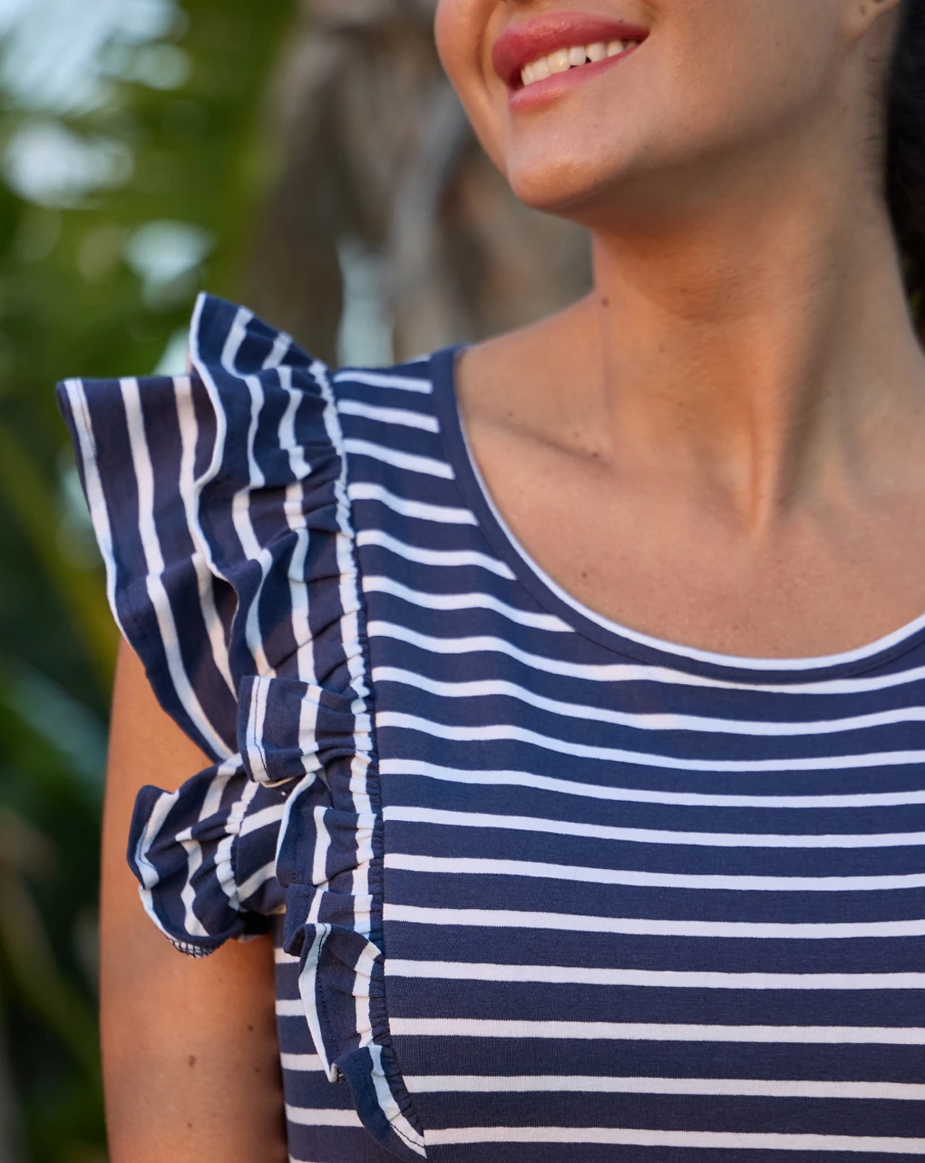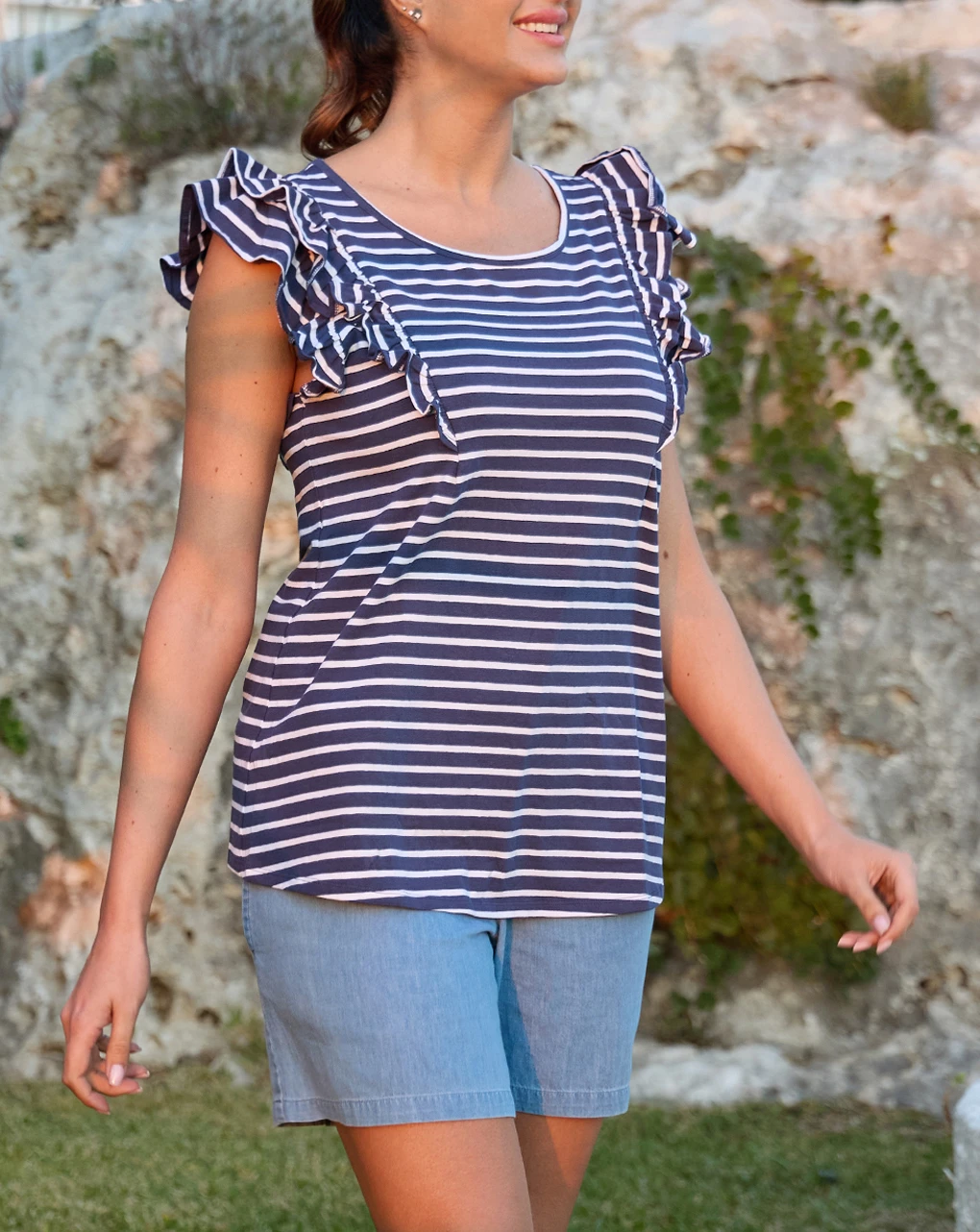 T-shirt senza maniche allattamento in jersey di cotone con stampa righe bianche e blu. La vestibilità è ampia e comoda, grazie anche alla qualità elastica del tessuto. Doppie rouches sul giromanica aggiungono un tocco romantico e molto femminile al capo.