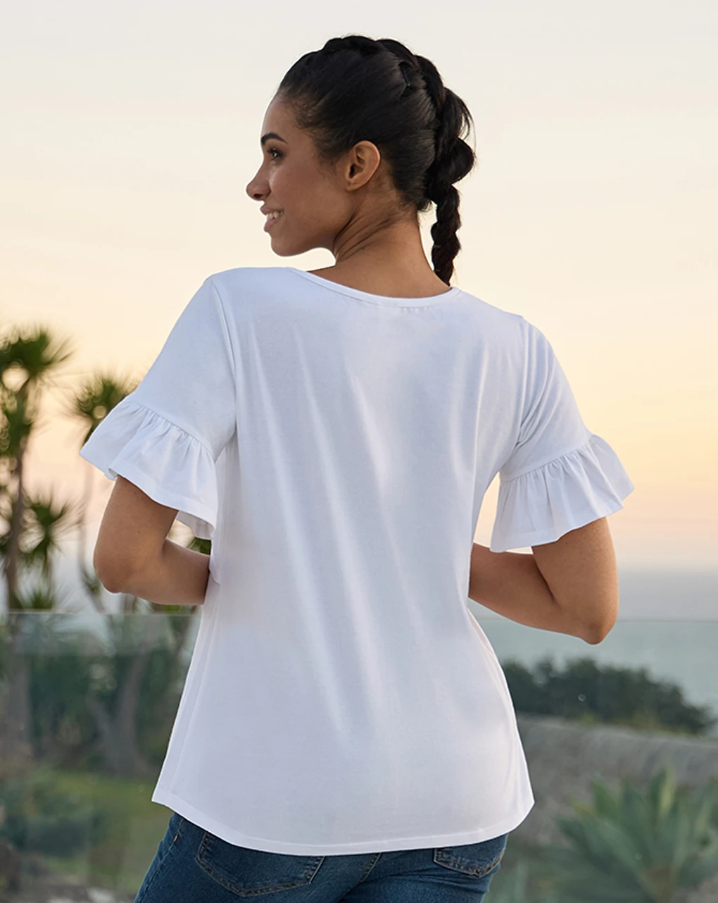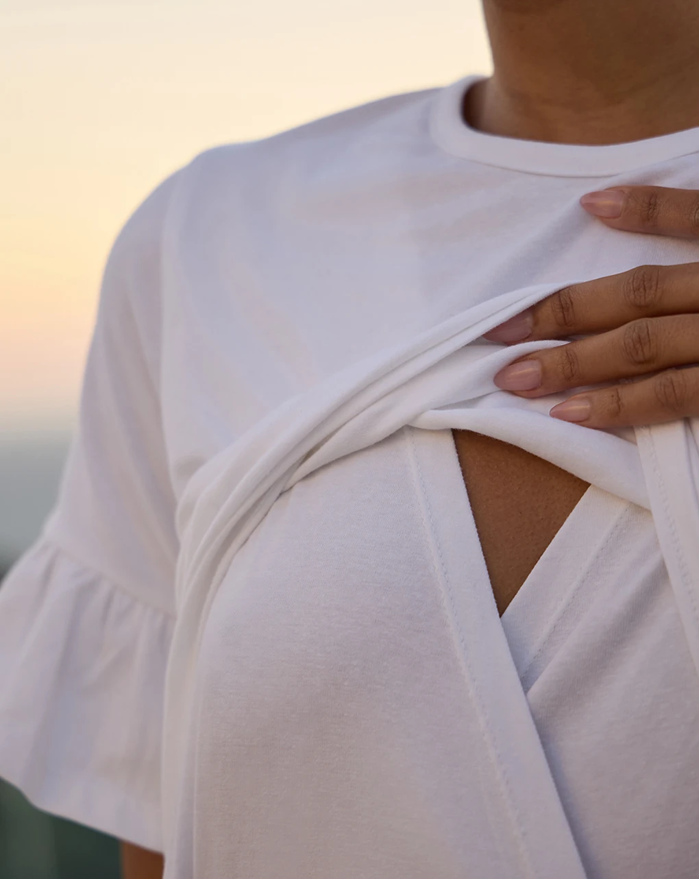 T-shirt allattamento bianca in jersey di cotone dal design semplice, arricchito da romantiche ruche sul fondo manica. Il modello presenta anche un lembo superiore, che si può sollevare con una sola mano, e un incrocio sottostante, per allattare in tutta comodità. Grazie al fit rilassato e alla qualità elastica del tessuto, può essere indossata anche durante la gravidanza.