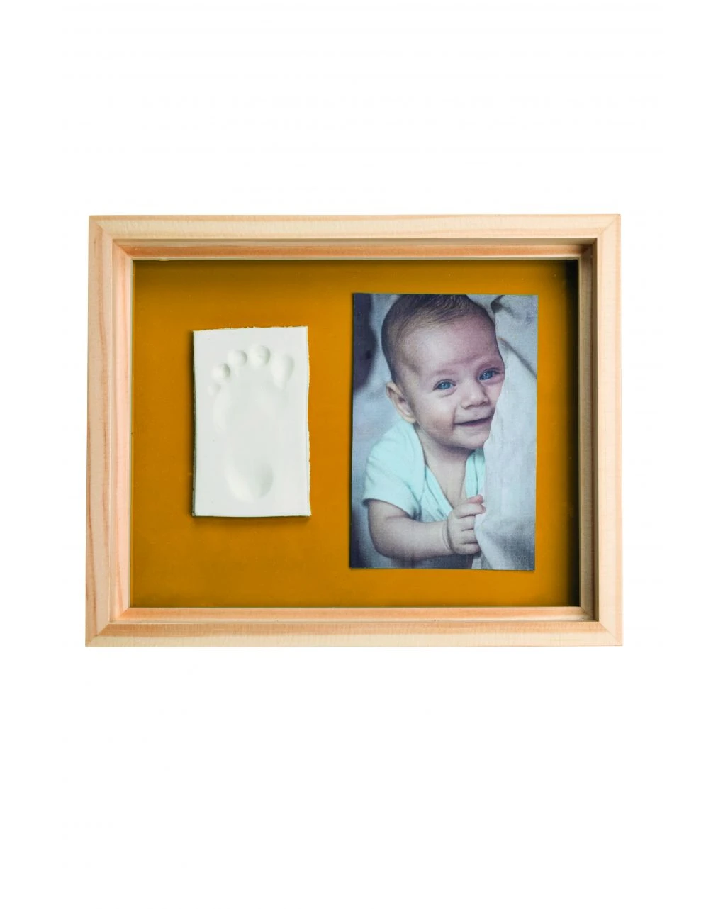Una gamma di prodotti con un approccio sostenibile per essere ancora più vicino alla natura senza danneggiarla. Elegante portafoto con spazio per una foto e un calco (della manina o del piedino del bebè), che puoi creare insieme al tuo piccolo per avere un ricordo unico e indimenticabile dei primi mesi. Argilla organica e sfondo reversibile inclusi nella confezione.