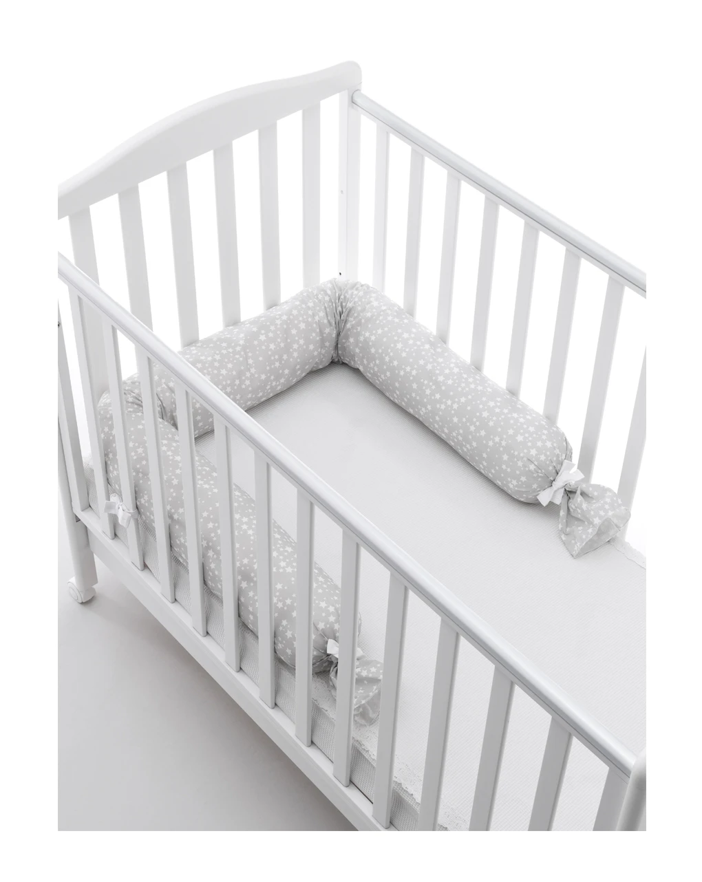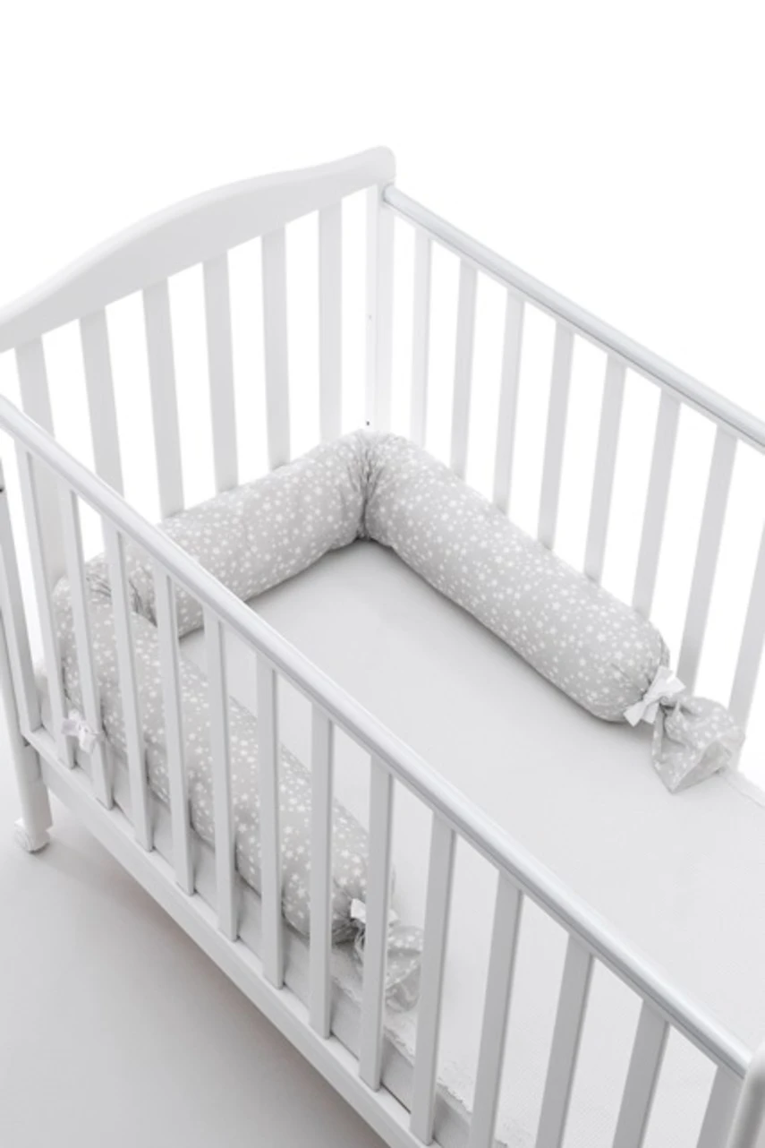Riduttore testa per lettino con fodera esterna sfoderabile in tessuto 100% cotone, imbottitura 100% fibra di poliestere. E’ possibile fissarlo al lettino grazie ai 3 laccetti laterali e riduce le dimensioni del piano letto rendendo più caldo e avvolgente il momento della nanna.