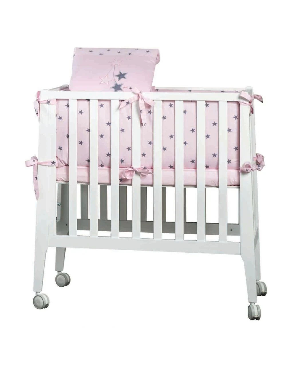 Rivestimento tessile ricamato per STELLA CONVERSE trasformato in CULLA, 4 pz.: piumino con federa + paracolpi giroculla ricamato + coprimaterasso + materasso – ROSA. Cm 33×248 para + 68×93 piumetto + 44×80 coprimaterasso + 44x85xh. 6 materasso