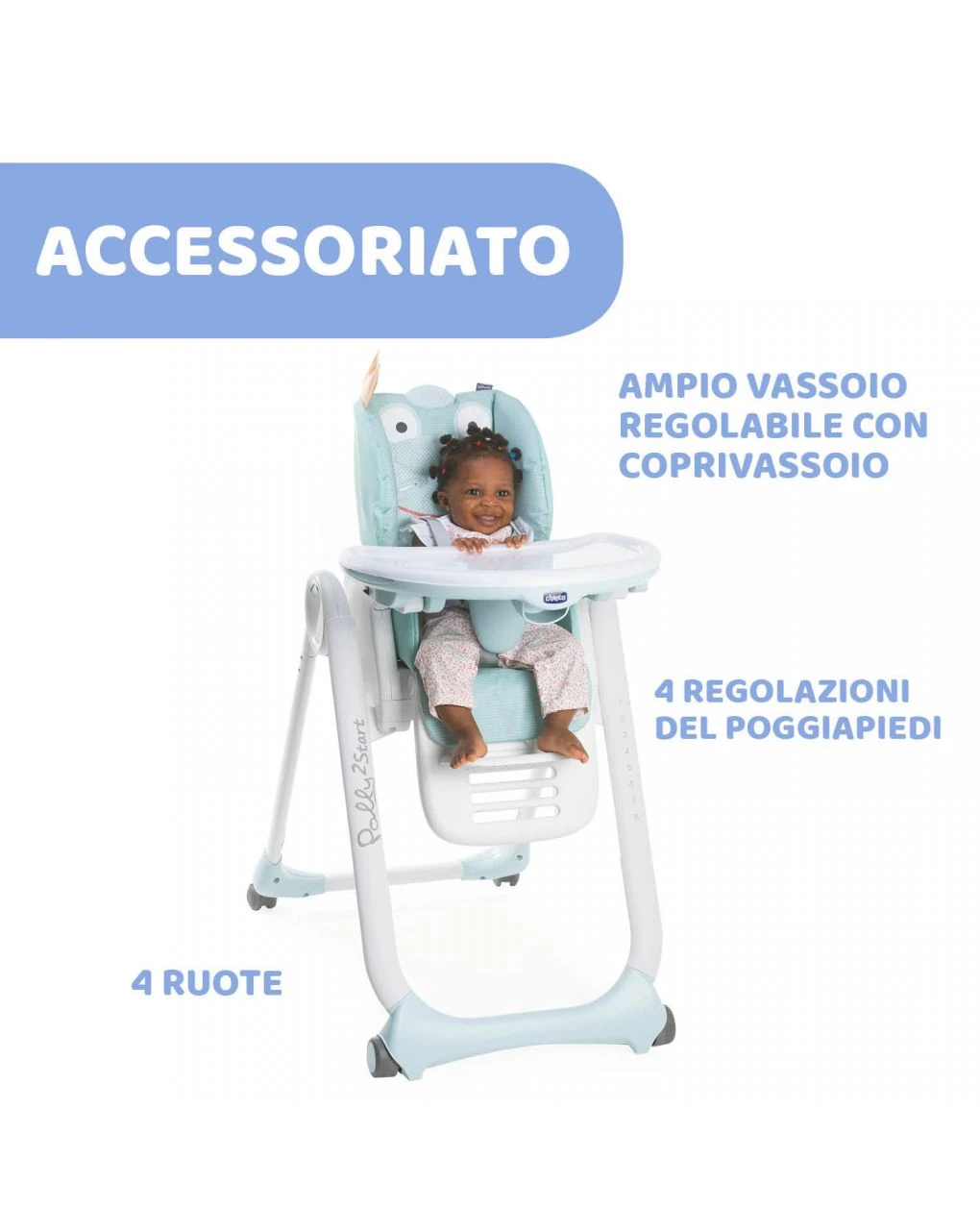 Scopri il pratico seggiolone Polly2Start di Chicco con 4 ruote per facili spostamenti e con schienale regolabile per adattarsi alla crescita del tuo bambino.