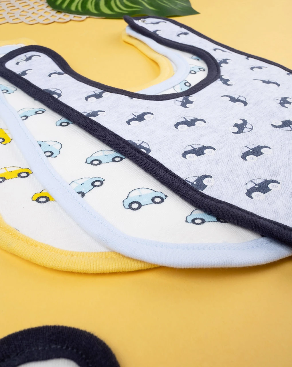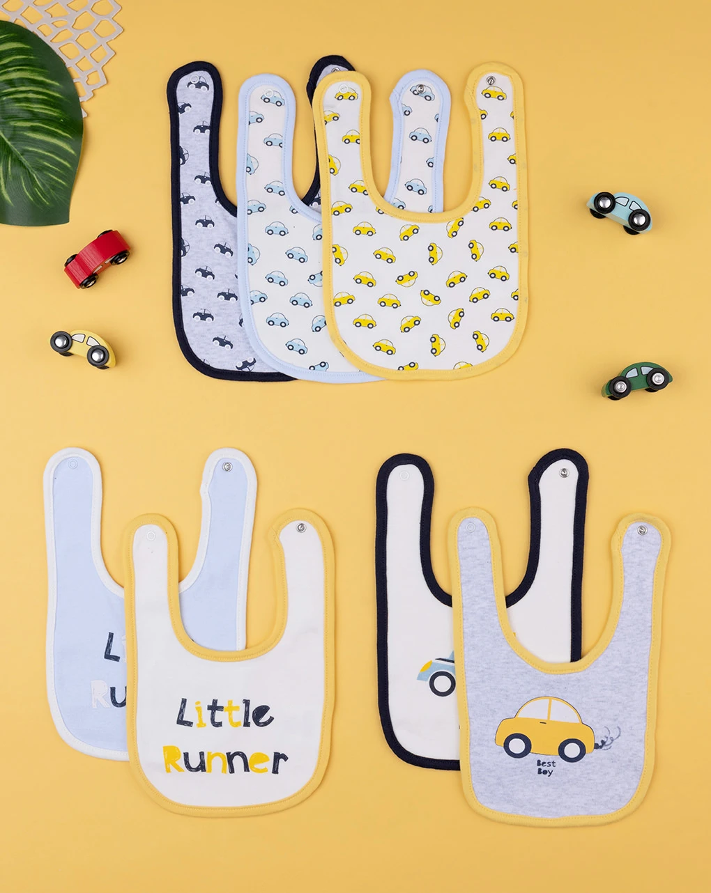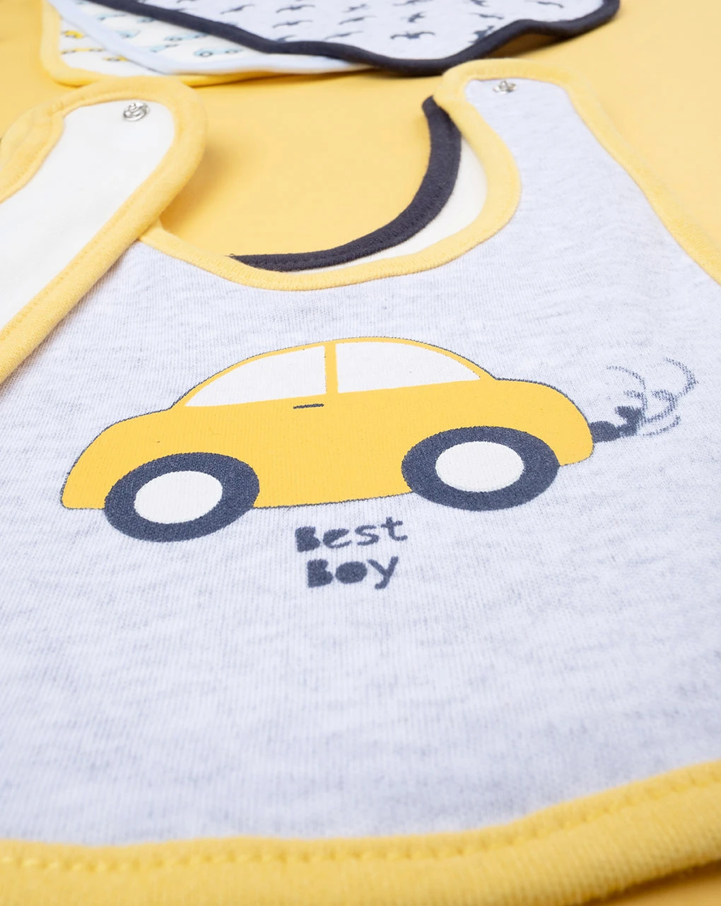 Pratico pack composto da sette bavaglioli bimbo realizzati in cotone interlock con fantasie varie